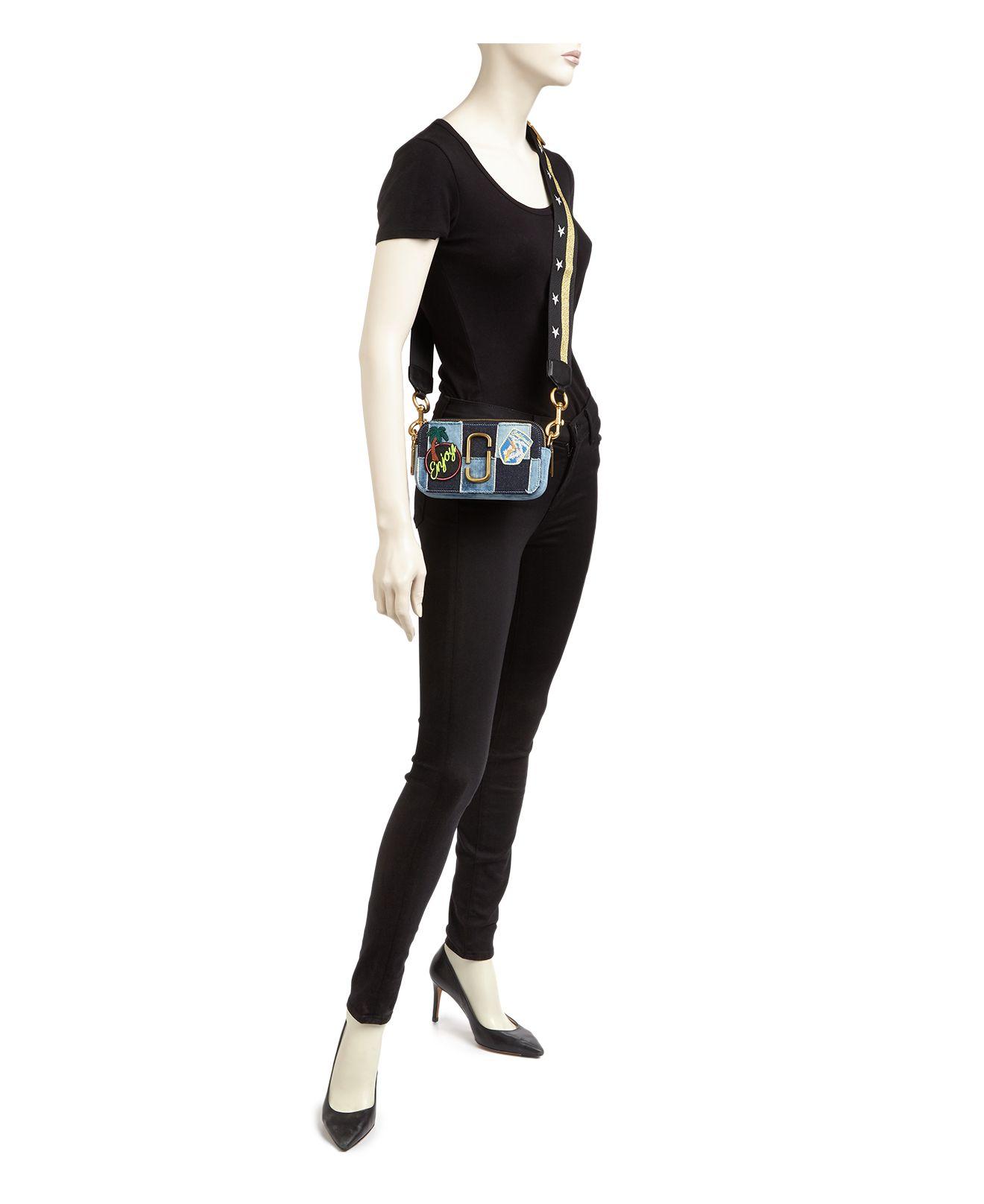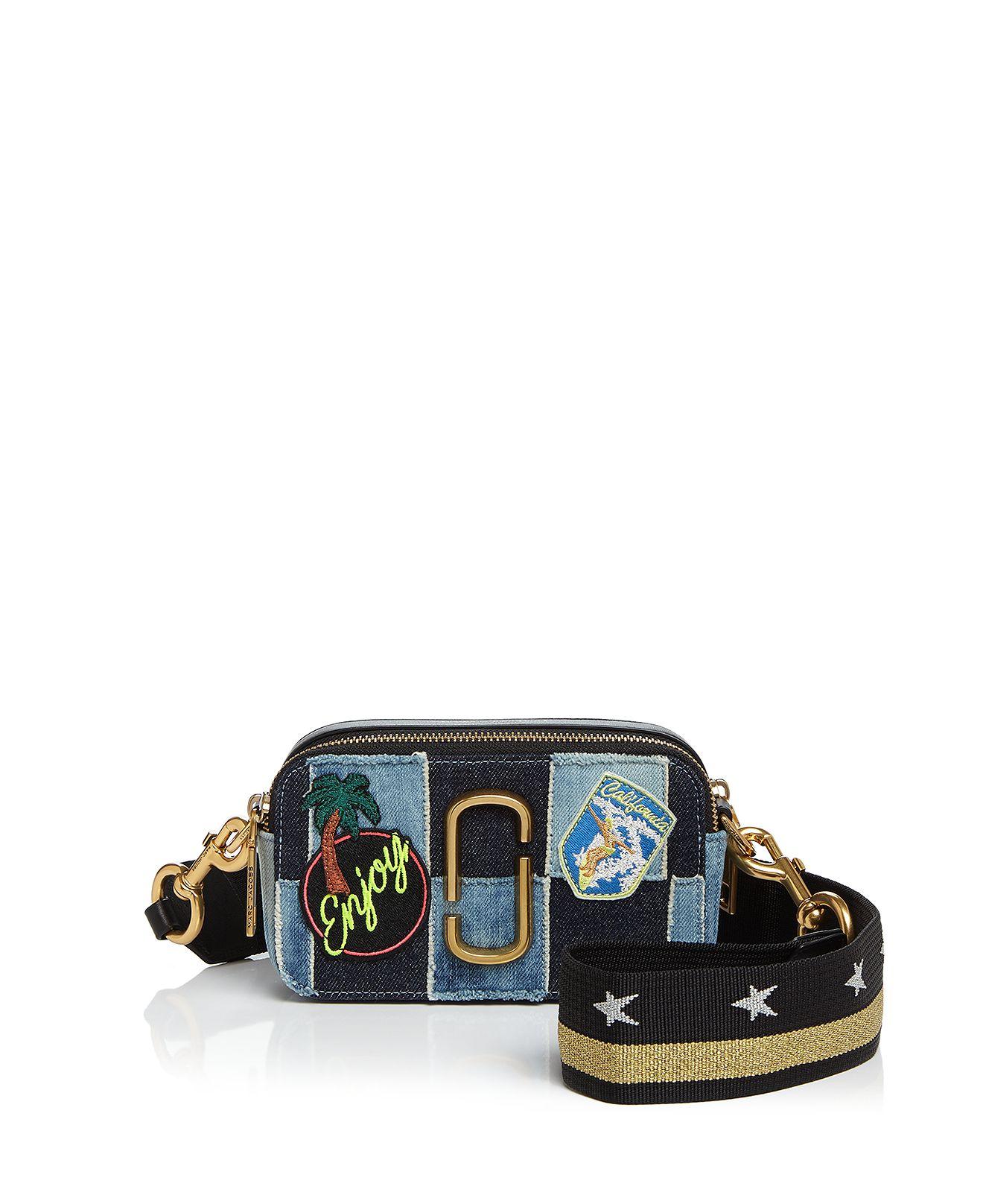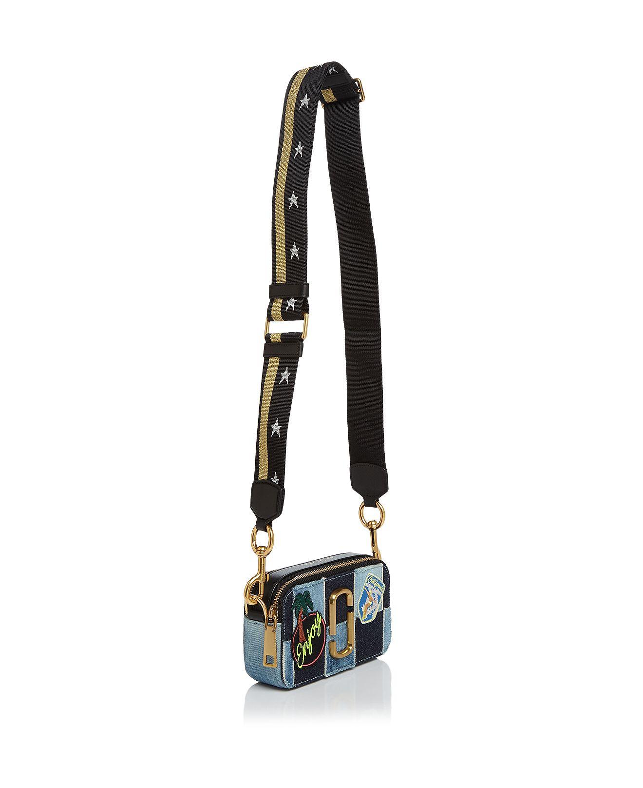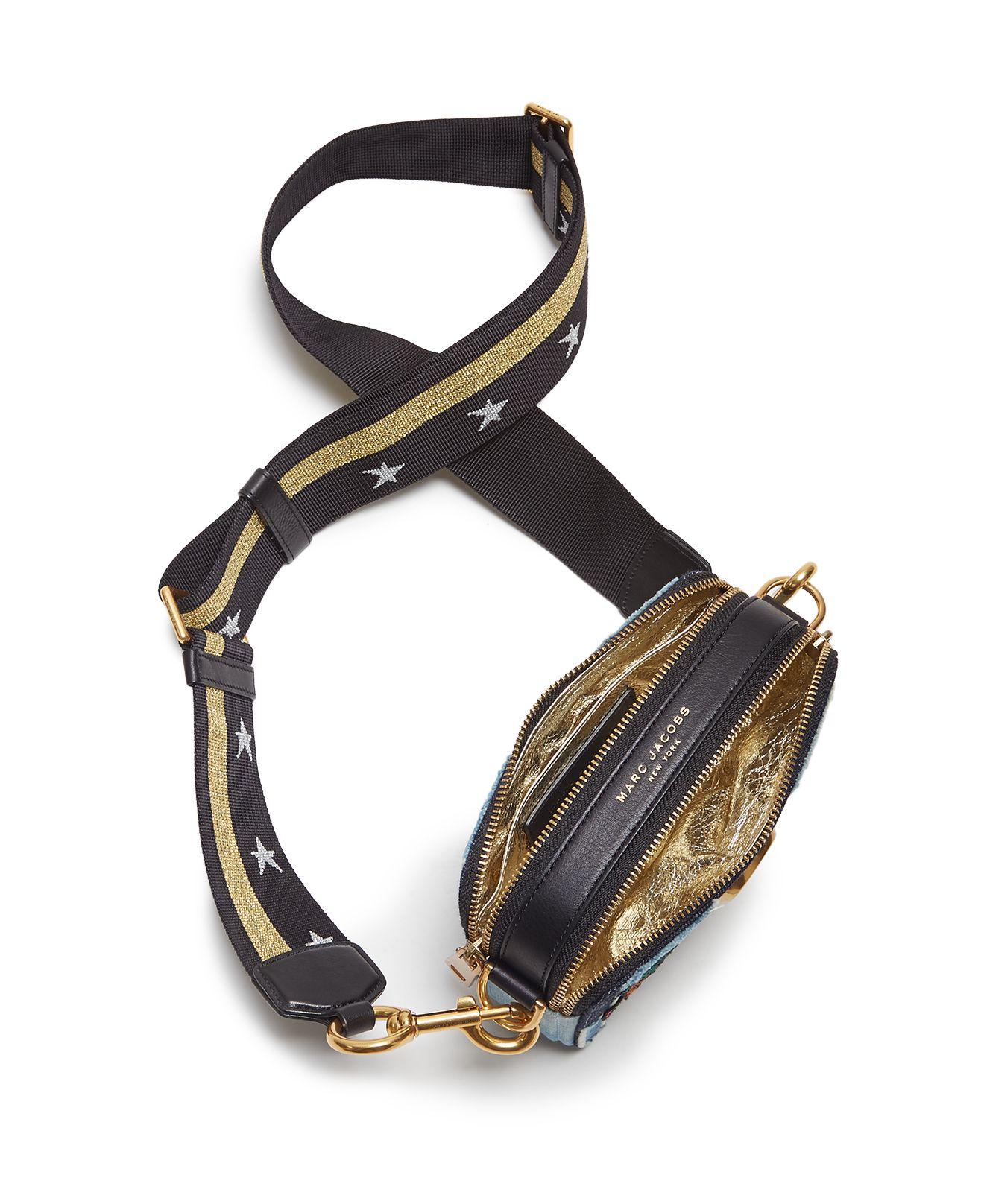 Denim patchwork camera bag with starry striped strap. Removable, adjustable web shoulder strap. Dual top zip closures. Goldtone hardware. Two outside zip pockes. One inside slip pocket. Metallic leather lining. 7"W X 4"H X 2"D. Cotton. Colour: blue