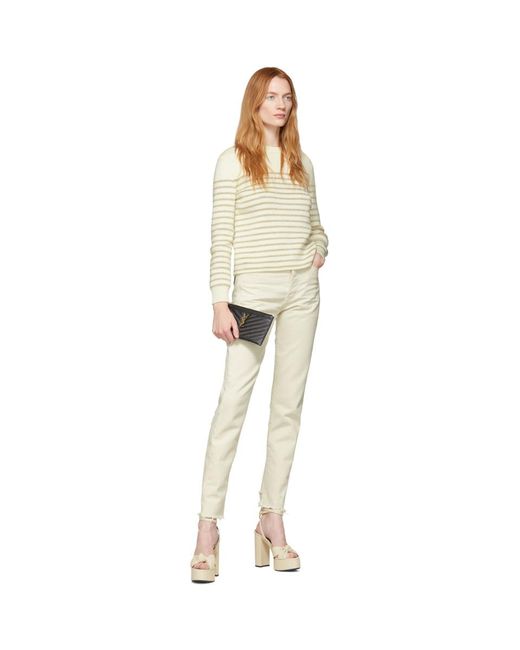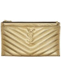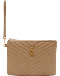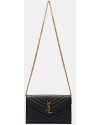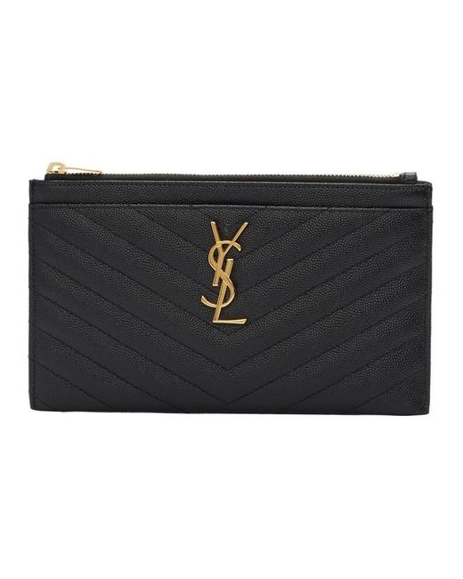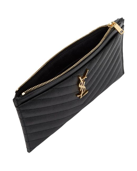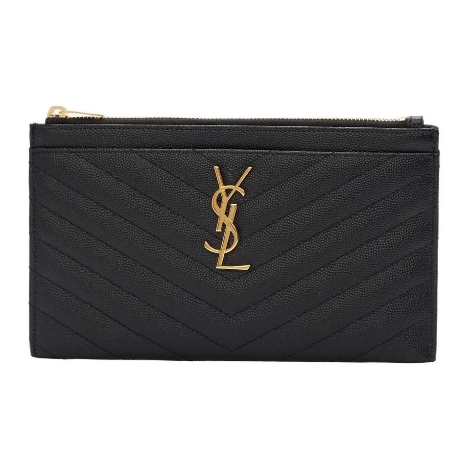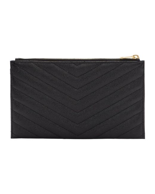 Quilted embossed calfskin pouch in black. Logo hardware and patch pocket at face. Zip closure. Patch pocket at interior. Tonal grosgrain lining. Antiqued gold-tone hardware. Approx. 8.25 length x 4.25 height. Colour: black