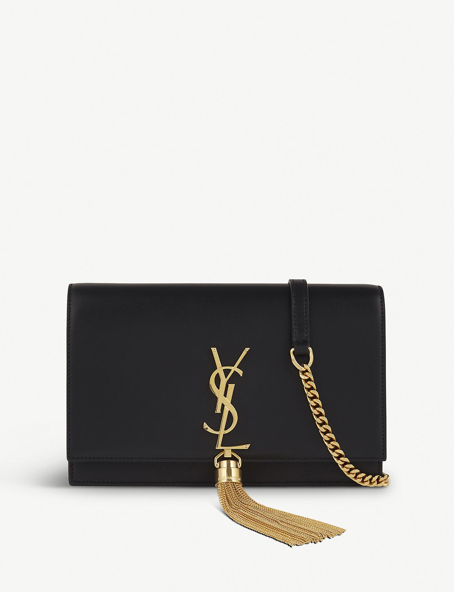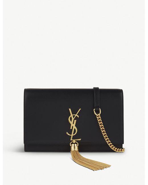 Paying homage to the Parisian fashion house's elegance and timeless aesthetic, Saint Laurent's Monogram Kate Tassel clutch marries impeccably smooth leather with polished gold toned hardware. With an optional curb chain strap, this slimline accessory opens to reveal ample space for evening essentials, while a delicate chain tassel hangs from the signature interlocking logo for a subtle statement finish. Height 12.5cm, width 19cm, depth 4cm, strap drop 60cm)Saint Laurent leather clutchTop flap, press stud closureDetachable strap, six card slots, zipped pocket, slip pocket, tasselUse specialist cleanerHeight 12.5cm, width 19cm, depth 4cm, strap drop 60cmMade in Italy. Colour: black