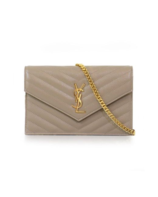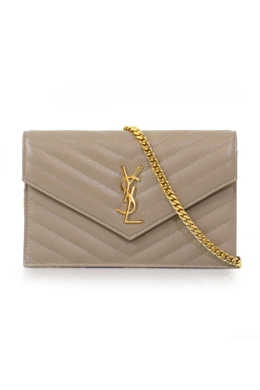 The saint laurent monogramme envelope wallet on chain bag features luxurious quilted grained leather, a detachable chain shoulder strap, monogram ysl logo, inside zip pocket and magnetic snap fastening. A very versatile stylish clutch or evening bag! Fabrication: 100% grained calfskin leather.