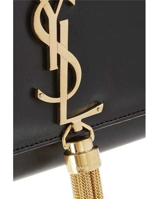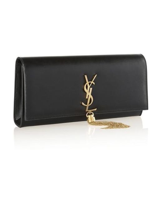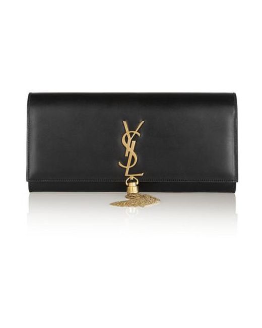 Elevate evening looks with Saint Laurent's black 'Monogramme' clutch. This smooth leather design is punctuated by the label's hallmark monogram and a tasselled embellishment. Style yours with a mini dress. Colour: black