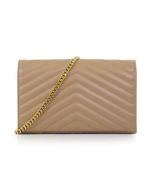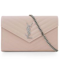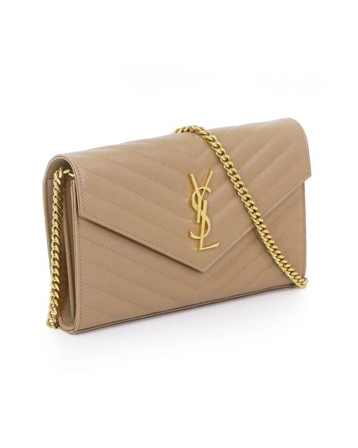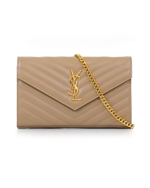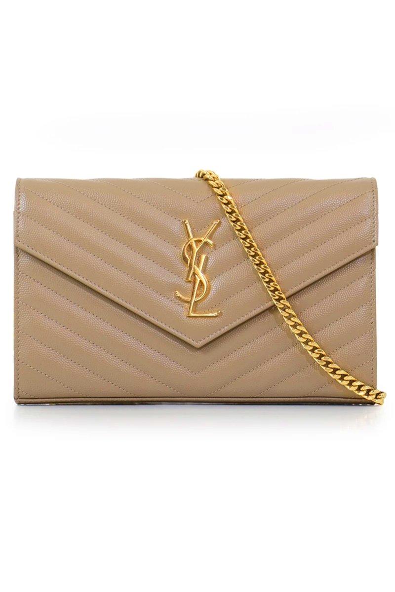 The saint laurent monogramme envelope wallet on chain bag features luxurious quilted grained leather, a detachable chain shoulder strap, monogram ysl logo, inside zip pocket and magnetic snap fastening. A very versatile stylish clutch or evening bag! Fabrication: 100% grained calfskin leather. Colour: metallic