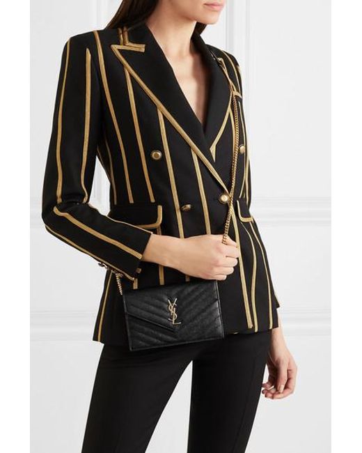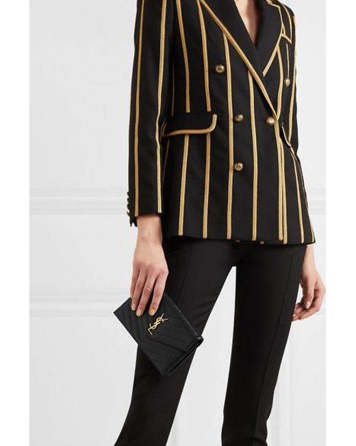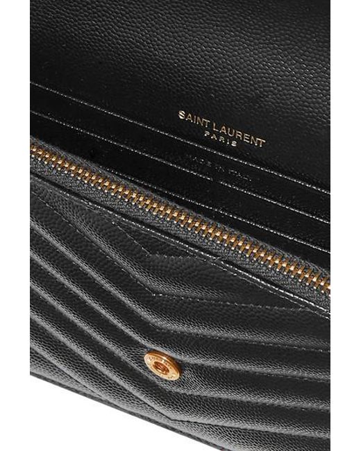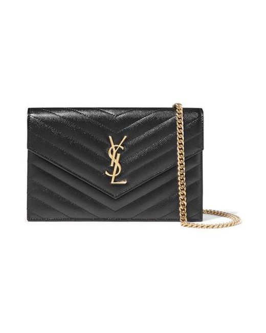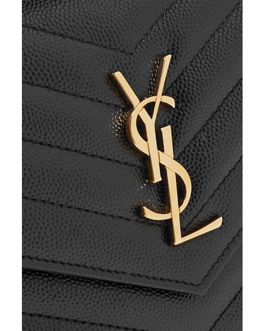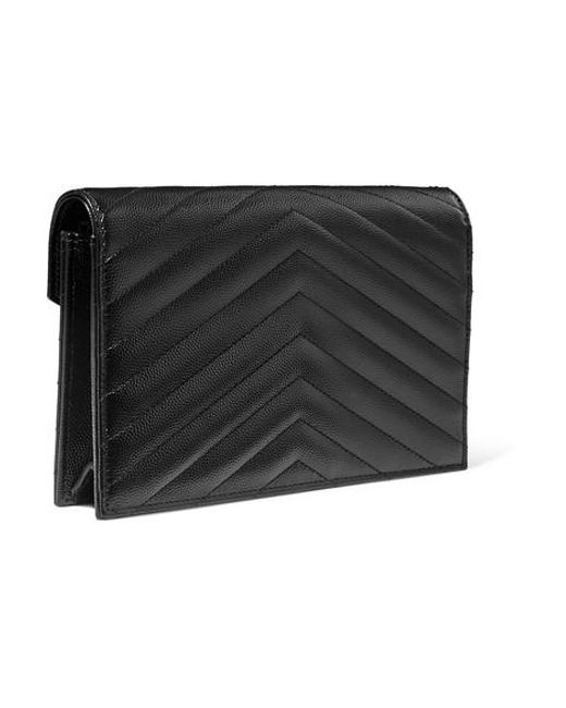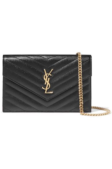 Few logos are more iconic than Saint Laurent's interlocking 'YSL' plaque, so you know this 'Monogramme' bag will always be a wise investment. This compact version has been made in Italy from quilted textured-leather in a structured envelope silhouette. It's fitted with a zipped pocket and plenty of card pockets inside, so you can leave your wallet at home. Remove the chain strap to carry it as a clutch in the evening. Colour: black
