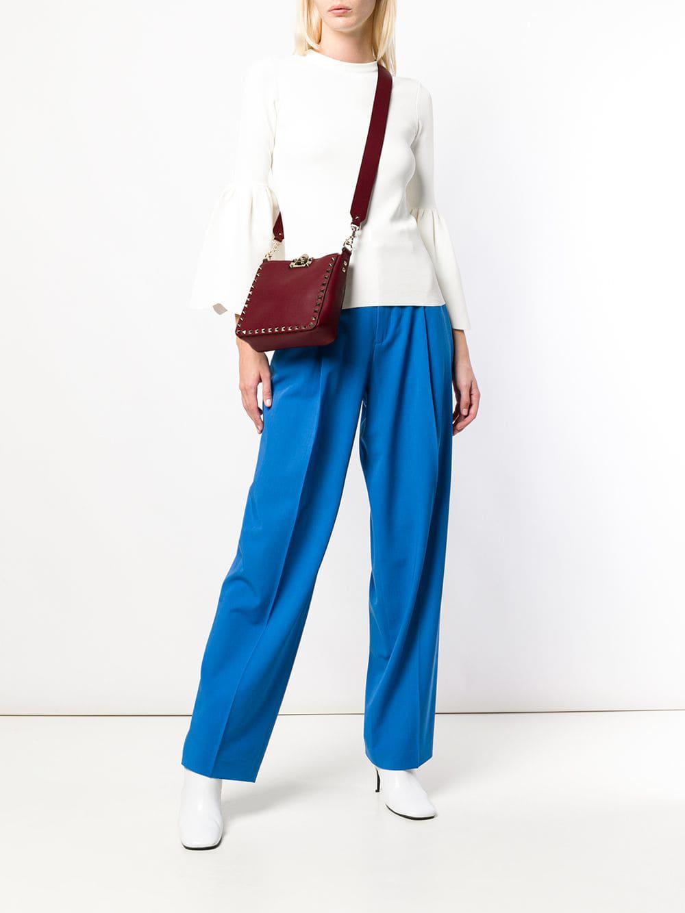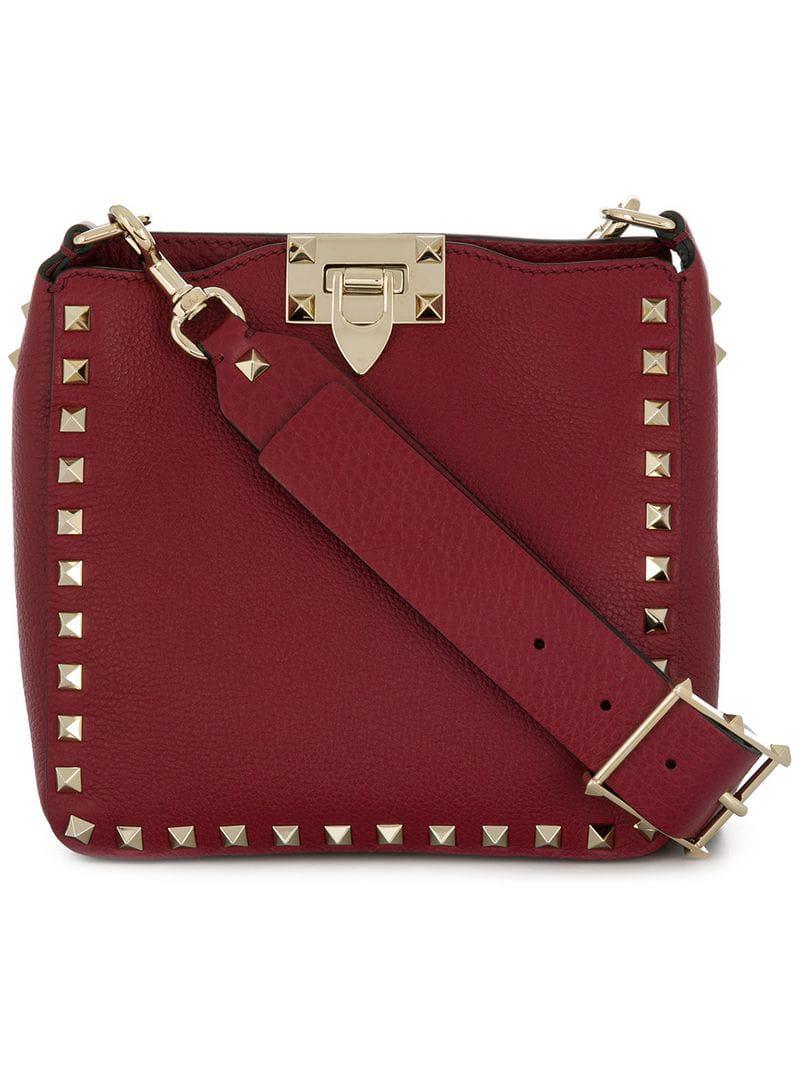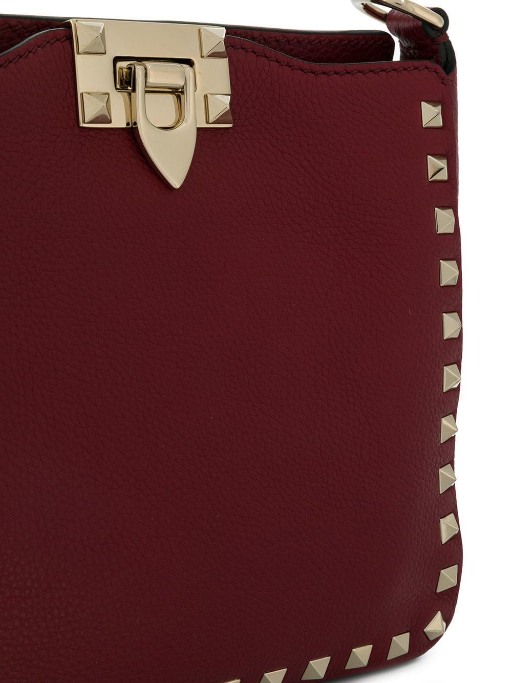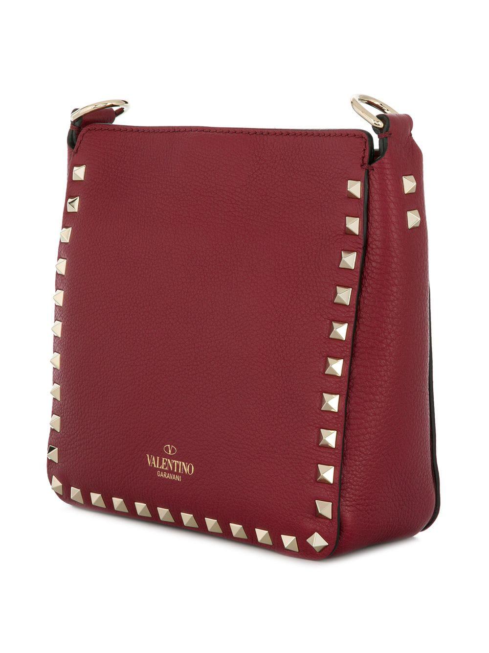 Go to FarfetchNew to Valentino's AW18 collection, this red calf leather Valentino Garavani Rockstud messenger bag features a detachable shoulder strap, gold-tone Rockstud embellishments, a back embossed logo stamp, a foldover top with flip lock closure, a main internal compartment, an internal zipped pocket and an internal logo patch. Material:Calf Leather. Colour: red