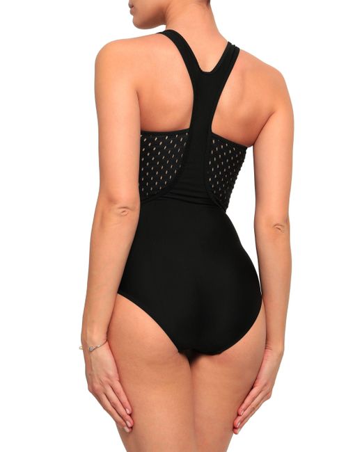 One-piece Stretch-polyamide Perforated Designer stamp Panelled Pulls on Hand wash. Imported This item is perfect for swimming. 78% Polyamide, 22% Spandex®. Colour: black