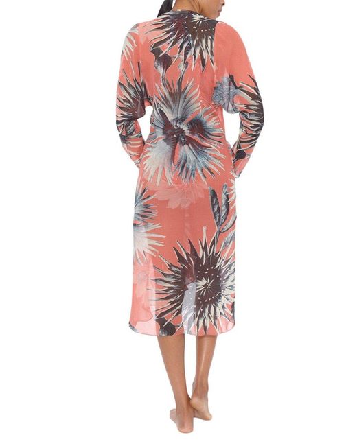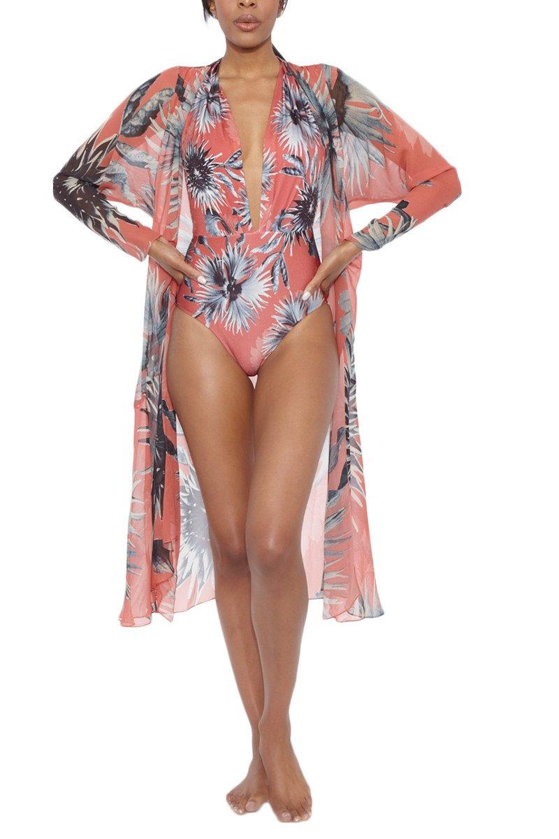 STYLE: Beautifully sheer 100% silk-crepe bikini coverup inspired by French Indochina. Deep coral colour offset by a silver-grey exotic floral print. Attached ties that can be worn either open, knotted in front, or wrapped around waist kimono style. High-low cut with delicately rolled hem detailing. Lightweight fabric creates a romantic flowing movement when worn. Feminine shirring details on shoulders. Slender cuffs on sleeves enhance elegant silhouette. Subtle, gold-plated Adriana Degreas brand logo on back of neckline. Designed as part of a limited edition collection. Wear with the Adriana Degreas Maxi Flower bikini set or style as a statement kimono. ADRIANA DEGREAS: Adriana Degreas is a Brazilian luxury resort and swimwear brand favored by fashion editors and trendsetters like Gigi Hadid, Demi Lovato, and Naomi Campbell. The brand has been featured in top fashion magazines like Vogue, Elle, and L'Officiel. All Adriana Degreas designer collection pieces are made in Brazil with high standard, classic craftsmanship. CARE INSTRUCTIONS: Dry clean only. 100% silk-crepe. Colour: pink