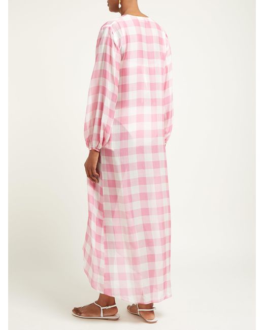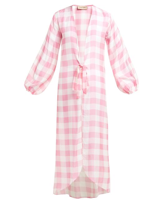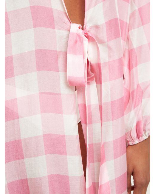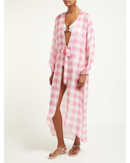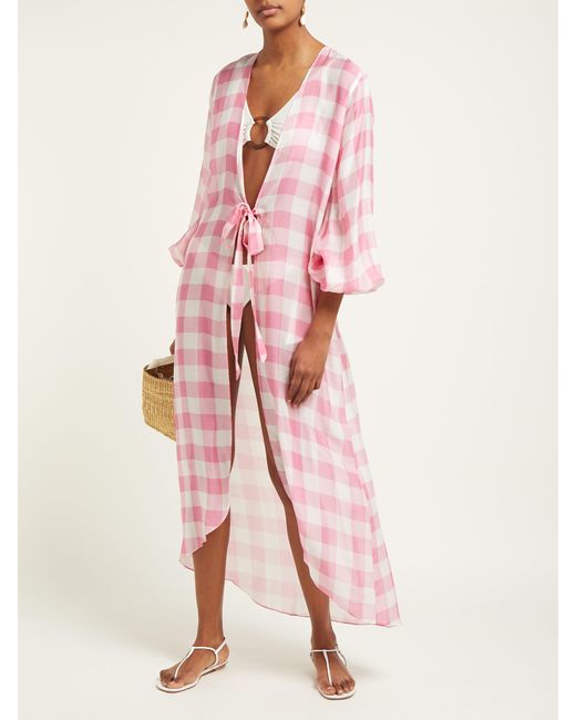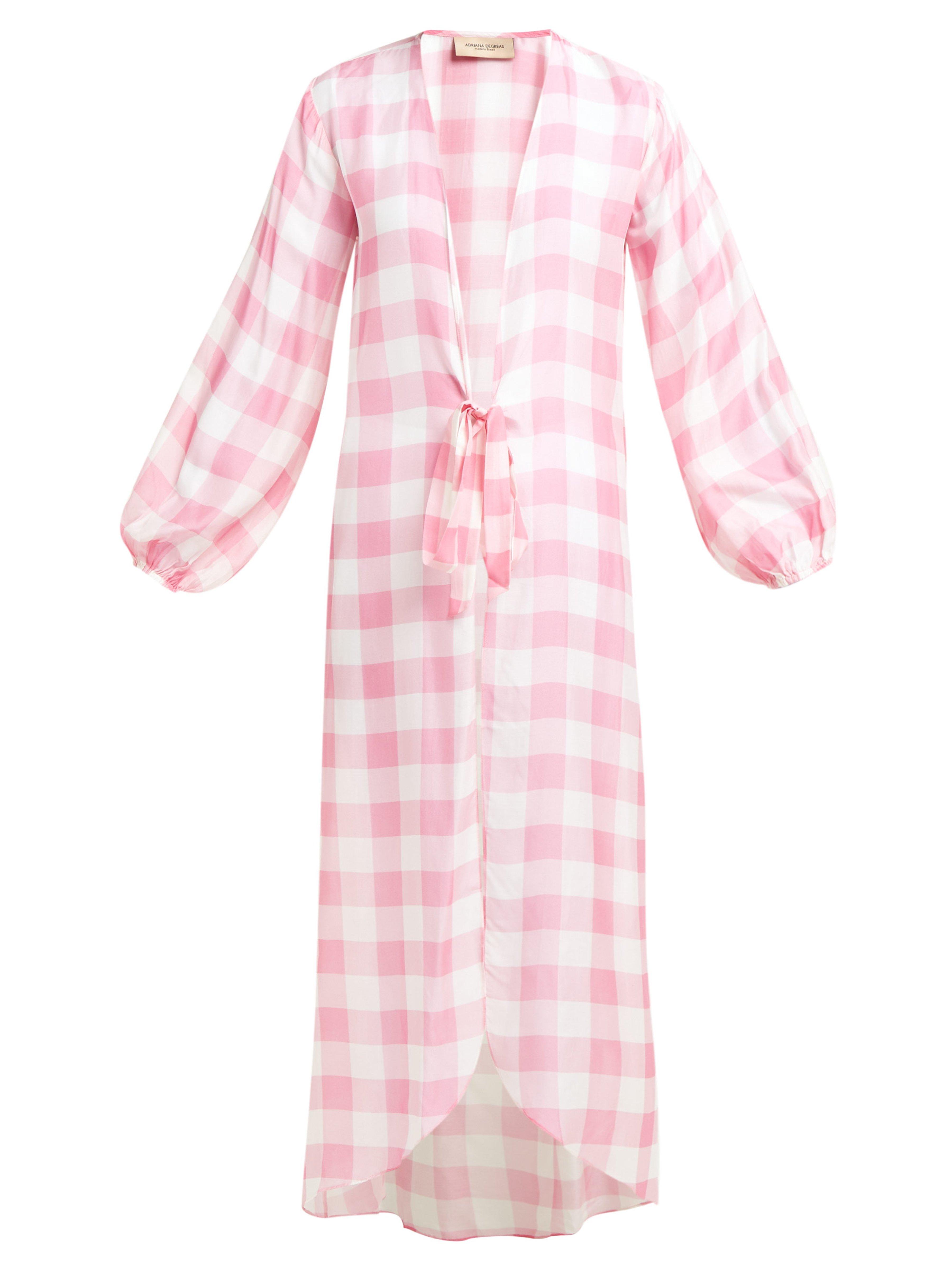 Gingham is a hallmark of Adriana Degreas's SS19 collection, as demonstrated by this pink and white robe. It's made from a lightweight, breathable georgette to an open silhouette which ties at the waist and is shaped with cropped balloon sleeves. Wear it over a bikini with neutral accessories for an understated beach edit. 73% MODAL 27% SILK. Colour: pink