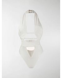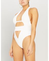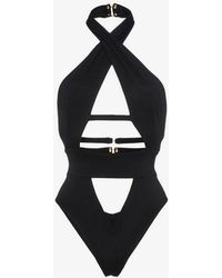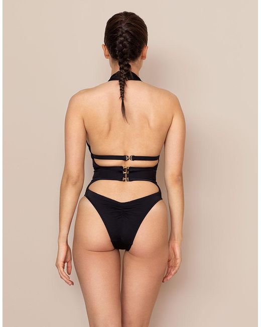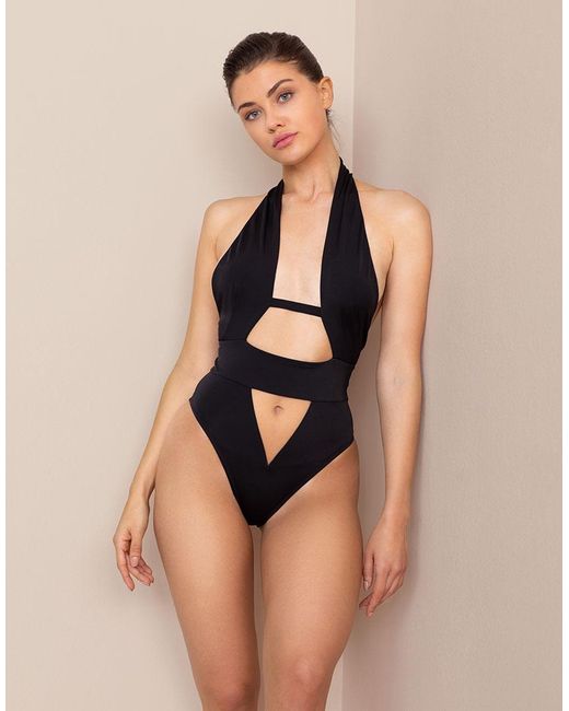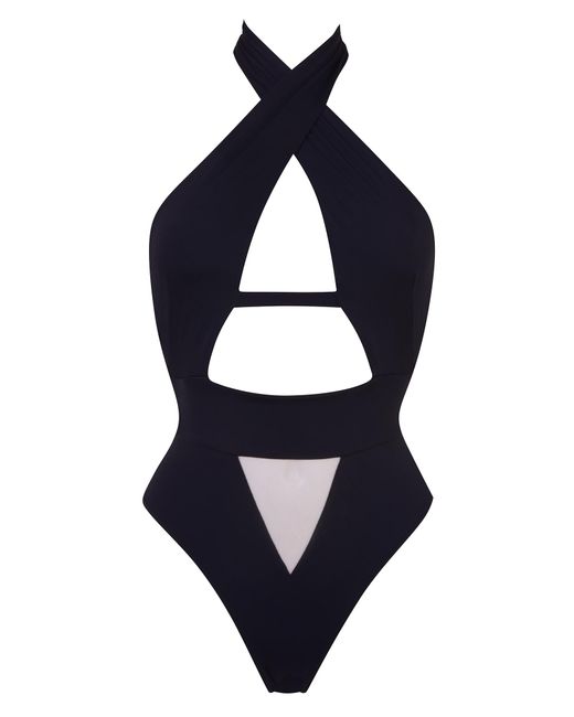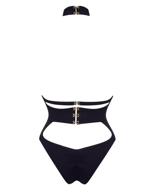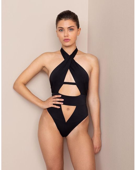 A contemporary aesthetic meets straight-up sex appeal in Anja. This stunning black swimsuit is meticulously structured to flatter and define your figure. Cut high for a leg-lengthening effect, it features a cross-over neckline sweeping down to meet tantalising cutaway panels between the cleavage and above and below the waistband. A narrow band beneath the bustline continues around the sides to fasten at the back, with a trio of three golden hook and eye clasps, echoed at the nape of the neck. The narrow-cut rear features a subtly ruched finish. 1= XS. 2= S. 3= M. 4= L. 5= XL. Model wears a size 2. Dimensions: Centre front underbust strap: 7cm. Bottom triangle: 11cm & 12cm. Colour: black