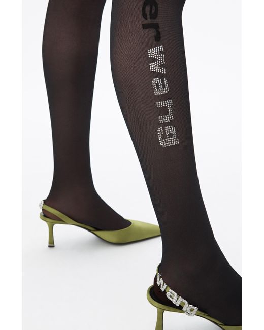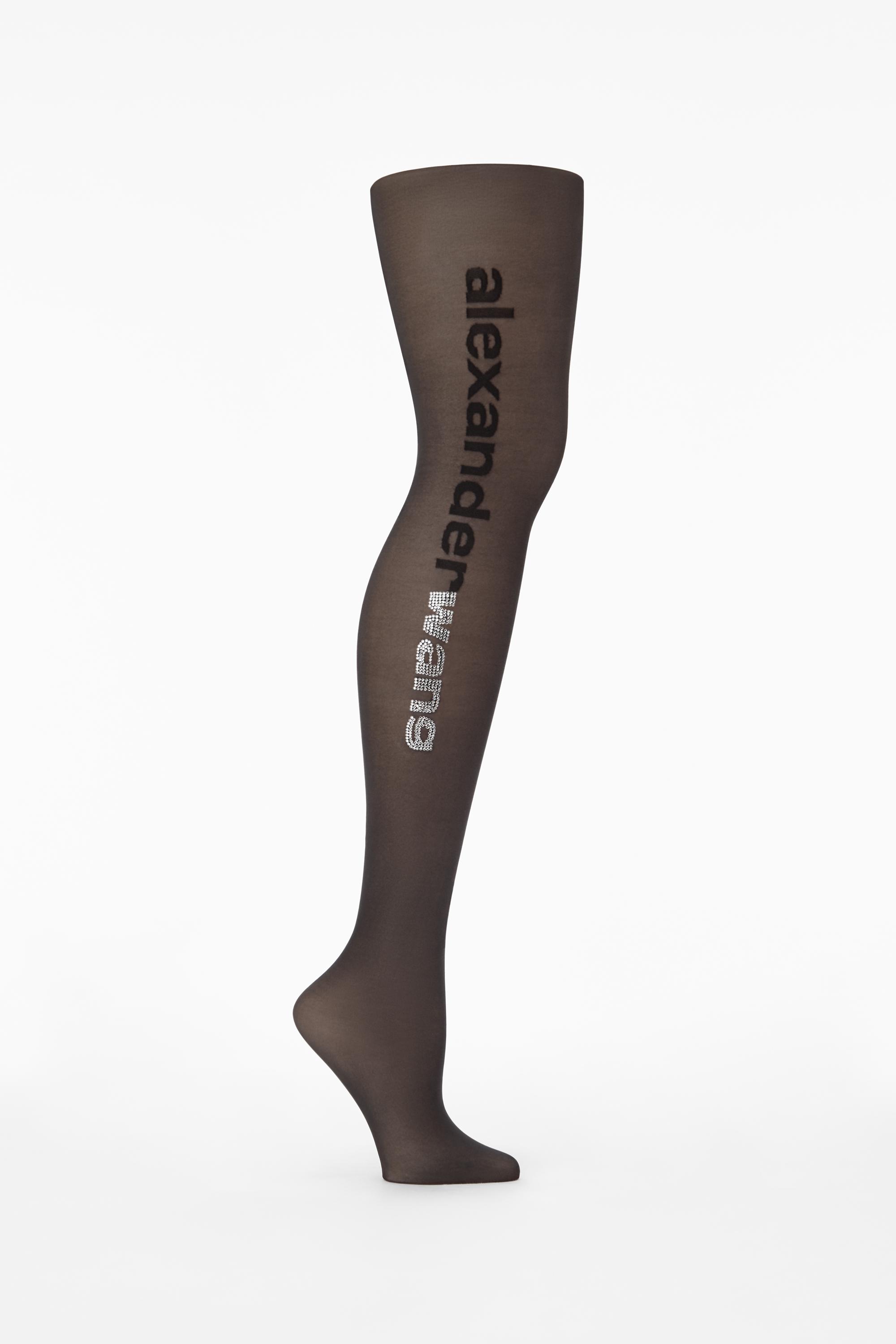 15 denier tights with jacquard and rhinestone logo detail at right leg. One size. Body/exterieur: 94% polyamide / 6% elastane. Made in italy. 1kc2199130. Hand wash cold separately. Do not bleach. Do not iron. Drip dry flat. Colour: black