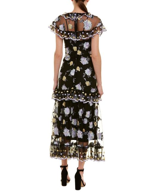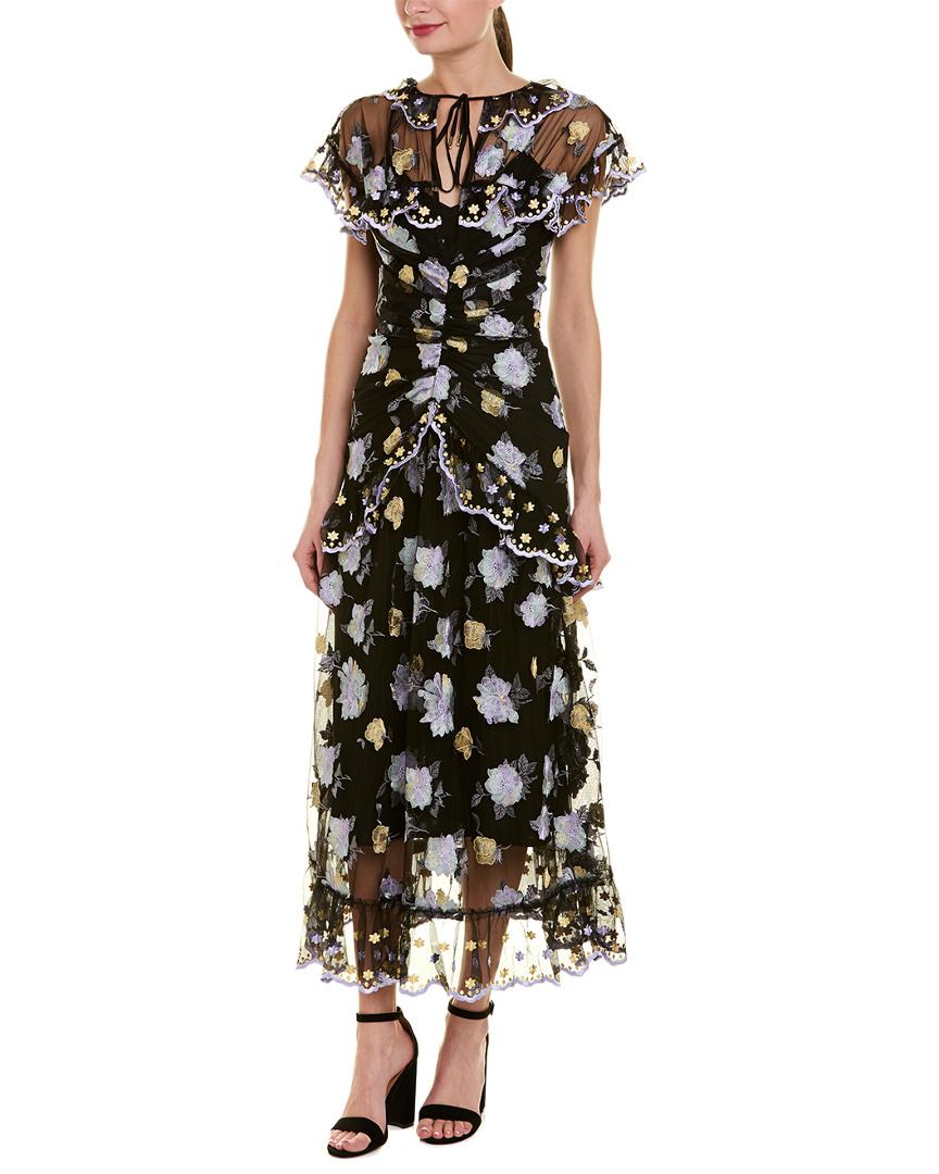 Please note: size selections are AU. For US conversions, reference size chart. Color/pattern: black. Approximately 57in from shoulder to hem. Measurement was taken from a size 8 and may vary slightly by size. Model is 5ft 10in. Design details: embroidered mesh design keyhole neck with self-tie closure shirring details ruffle trim slip dress lining. Center back zipper with hook-and-eye closure. 100% polyester. Dry clean only.