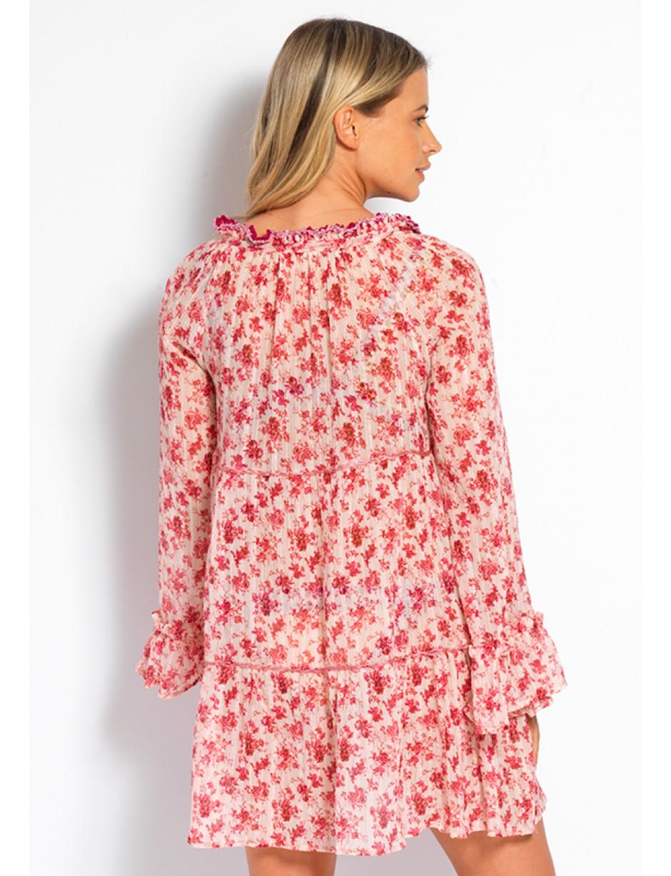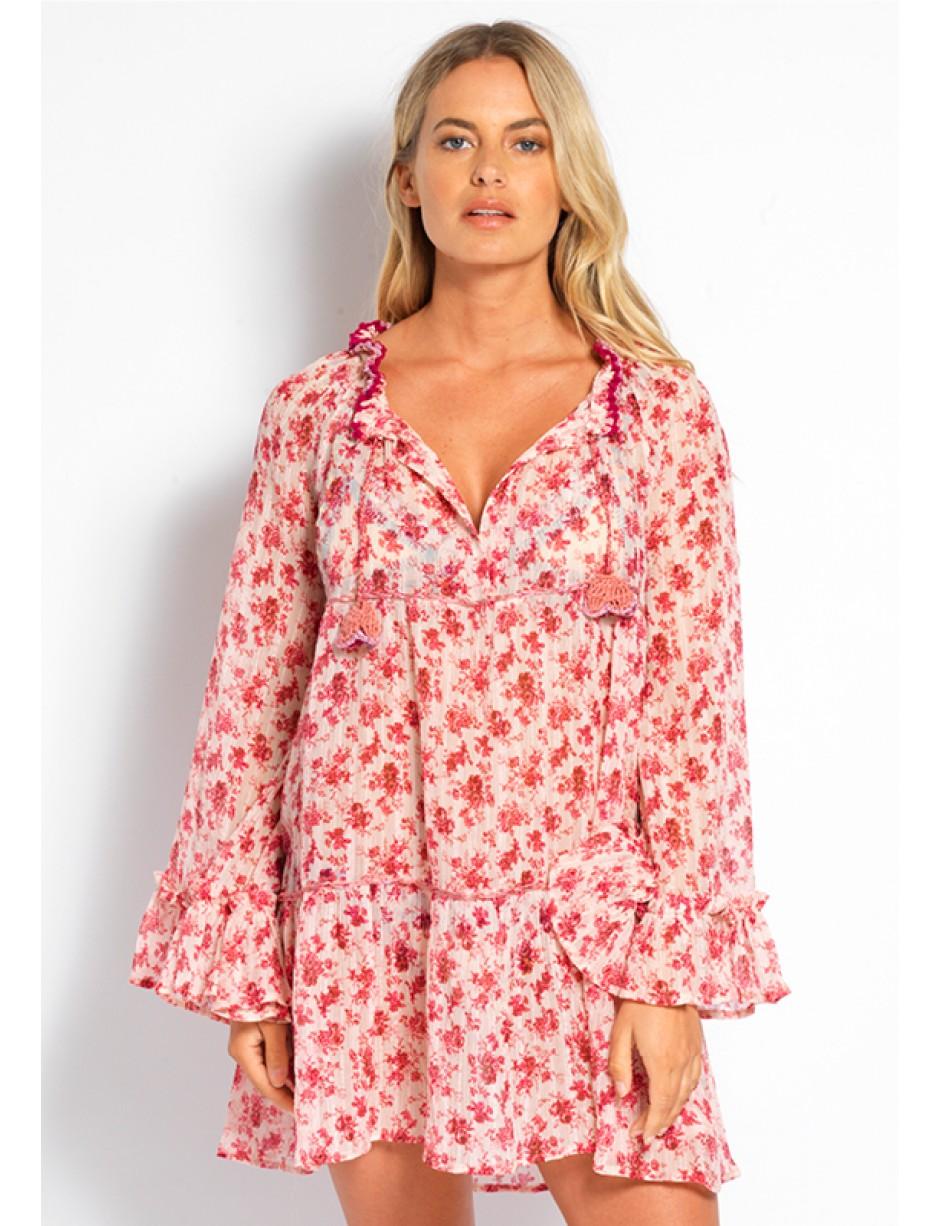 Look effortlessly chic in the Rebecca Mini Kaftan from beachwear designer Anjuna. Made from delicate toile with feminine pink floral print. Finished with gathered collar detail with knitted floral ties, long sleeves with fluted cuffs and a tiered skirt. Colour: pink
