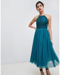 Tall dress by ASOS DESIGN, Be the best-dressed guest, High neck, Lace overlay, Fitted waist, Open back, Zip fastening, Regular fit - a standard cut for a classic shape. Giving you the confidence to express your individuality, ASOS DESIGN interprets major trends, adding a unique ASOS spin from our London design team. All the denim, dresses, jackets and pieces you need ' including our fit ranges ASOS Curve, Tall, Petite and Maternity and our ASOS DESIGN Makeup collection ' to invent a style that's all yours, then switch it up again tomorrow, making every day, night and everything in-between as extraordinary as you are. Your life is eclectic and unexpected and, now, so is your wardrobe. Denim/ polyester. Colour: green