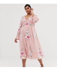 Midi dress by ASOS DESIGN, Yeah, we like this one, too, V-neck, Long sleeves with fluted cuffs, Embroidered floral design, Not just your average print, Zip-back fastening, Regular fit, True to size. Giving you the confidence to express your individuality, ASOS DESIGN interprets major trends, adding a unique ASOS spin from our London design team. All the denim, dresses, jackets and pieces you need ' including our fit ranges ASOS Curve, Tall, Petite and Maternity and our ASOS DESIGN Makeup collection ' to invent a style that's all yours, then switch it up again tomorrow, making every day, night and everything in-between as extraordinary as you are. Your life is eclectic and unexpected and, now, so is your wardrobe. Denim/ polyester/ print/ viscose. Colour: pink