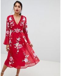 Midi dress by ASOS DESIGN, Yeah, we like this one, too, V-neck, Long sleeves with fluted cuffs, Embroidered floral design, Not just your average print, Zip-back fastening, Regular fit, True to size. Giving you the confidence to express your individuality, ASOS DESIGN interprets major trends, adding a unique ASOS spin from our London design team. All the denim, dresses, jackets and pieces you need - including our fit ranges ASOS Curve, Tall, Petite and Maternity and our ASOS DESIGN Makeup collection - to invent a style that's all yours, then switch it up again tomorrow, making every day, night and everything in-between as extraordinary as you are. Your life is eclectic and unexpected and, now, so is your wardrobe. Denim/ polyester/ print/ viscose.