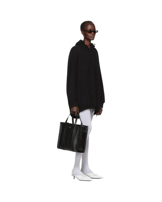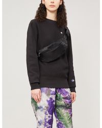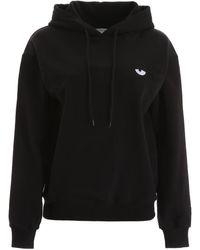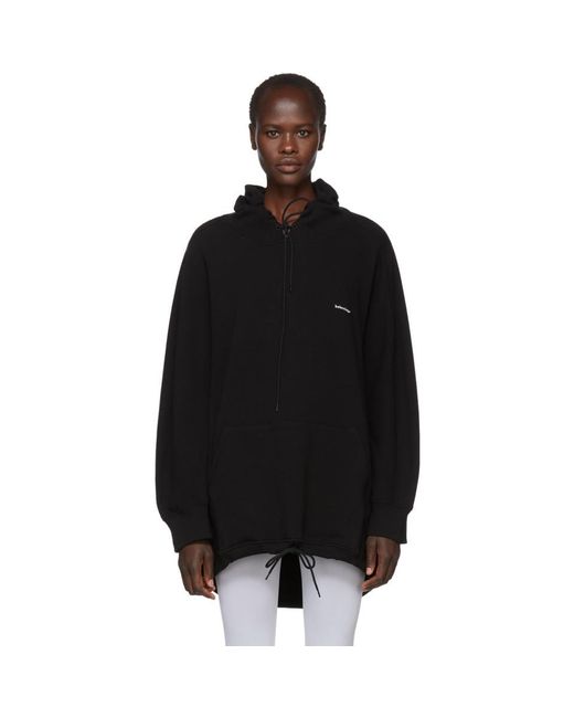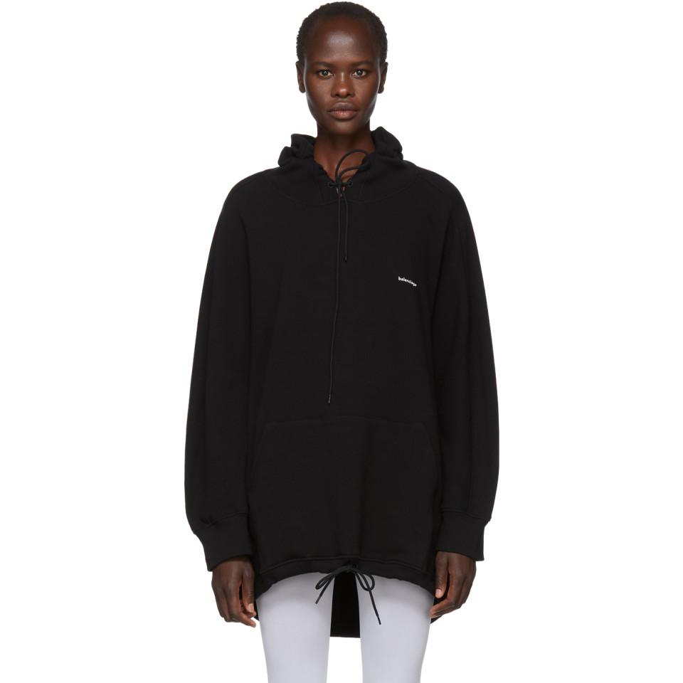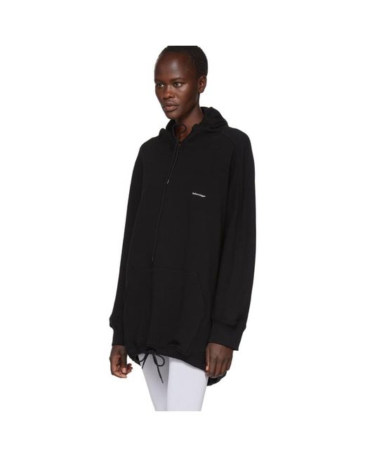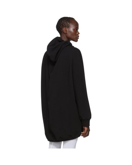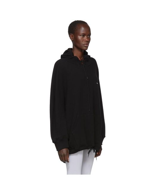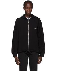 Long sleeve stretch French terry hoodie in black. Drawstring at hood. Logo printed in white at bust. Kangaroo pocket at waist. Rib knit cuffs. Drawstring at rib knit hem. Tonal stitching. Colour: black