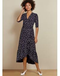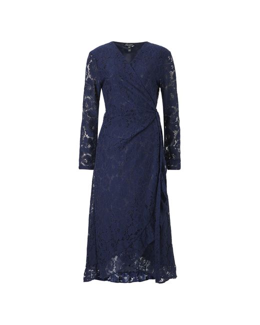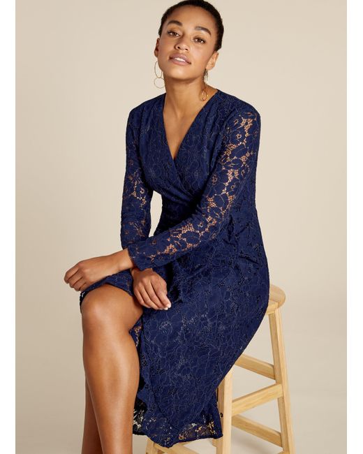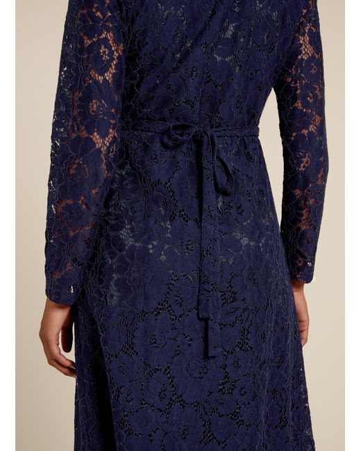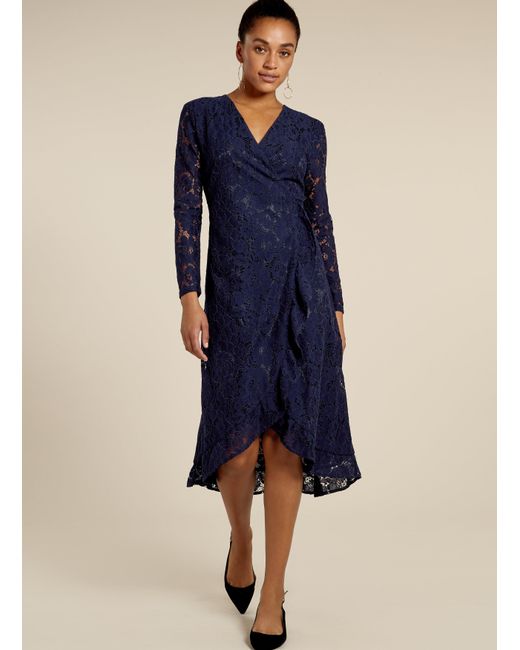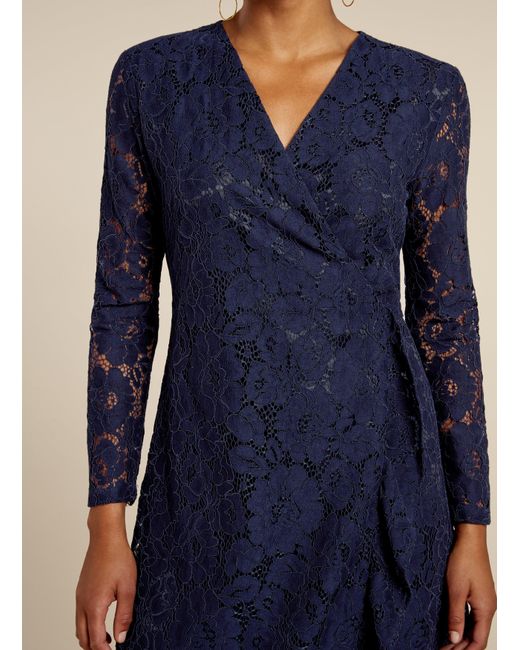 Fits true to size, we suggest ordering your normal size. One to turn heads with this party season! The statement lace creates a sheer look along the slim fit sleeves, whilst adding beautiful detail to the rest of the dress. Fitted in a functioning wrap style, with lace ties at the waist and a lace ruffle hem. Chic and timeless - perfect for dancing the night away! V neckline. Midi length. Functioning wrap design. Unlined lace sleeves. 50% cotton, 25% viscose, 25% nylon. Machine wash - 30°. Back shoulder at neck to hem - 122cm (48"). Sleeve length - 57cm (22 3/8"). Colour: blue