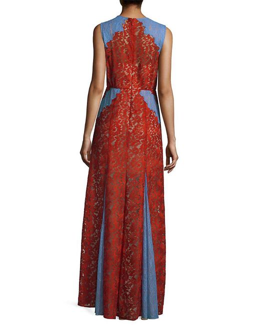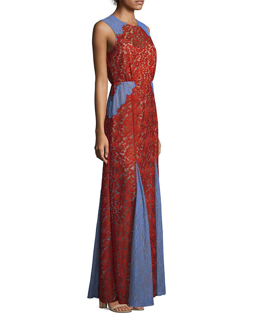 Color/pattern: red and blue Approximately 60in from shoulder to hem Measurement was taken from a size 4 and may vary slightly by size Model is 5ft 9in Design details: lace design; round neckline; panel insets; sheer detail; lined Center back zipper closure Shell: 100% nylon Contrast: 100% polyester Lining: 99% polyester, 1% spandex Dry clean only Imported.