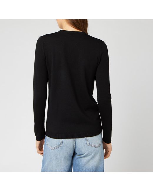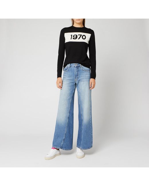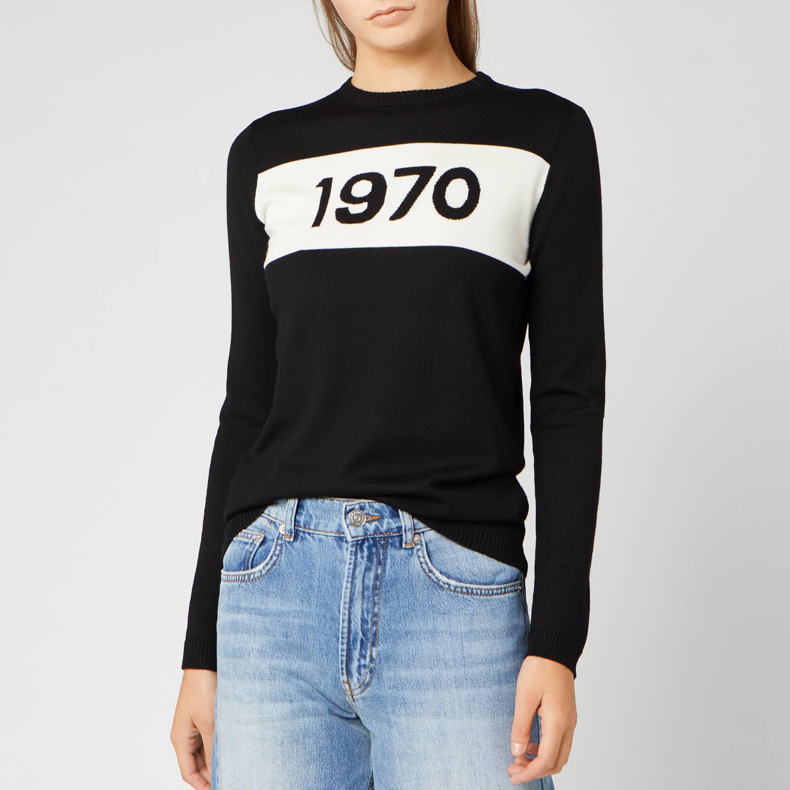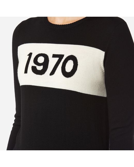 Women's crew neck jumper from Bella Freud. Crafted from pure merino wool, the monochrome jumper features a contrast panel across the chest with '1970' intarsia; its rough charm is a nod to New York's 70's punk scene. Finished with a ribbed crew neck, hem and cuffs. 100% Merino Wool. Model is 178cm/5'10 and wears a size S. Colour: black