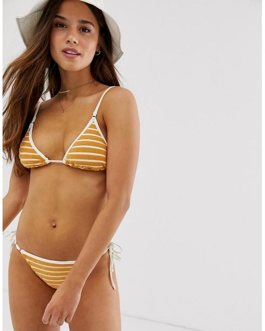 Bikini top by Billabong, Just add water, Triangle cups, Adjustable straps, Tie closure. In 1973, Billabong founders Gordon and Rena Merchant started crafting and selling board shorts to surf shops on Australia's Gold Coast. Thanks to the durable, triple-stitching technique they used, their designs became go-tos for local surfers, and the rest is history. Take a look at our edit of the brand's surf, swim and beachwear - its swimsuits and bikinis are always board-ready. Elastane/ gold/ polyamide/ polyester.