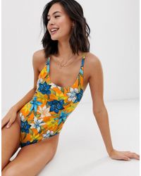 Swimsuit by Billabong, Just add water, All-over palm print, High neck for extra coverage, Long sleeves, Small logo detail to chest, Zip-back fastening with pull tab, For an easy on and off, Brazilian cut, UPF 50. In 1973, Billabong founders Gordon and Rena Merchant started crafting and selling board shorts to surf shops on Australia's Gold Coast. Thanks to the durable, triple-stitching technique they used, their designs became go-tos for local surfers, and the rest is history. Take a look at our edit of the brand's surf, swim and beachwear ' its swimsuits and bikinis are always board-ready. Elastane/ gold/ polyester/ print. Colour: multicolour