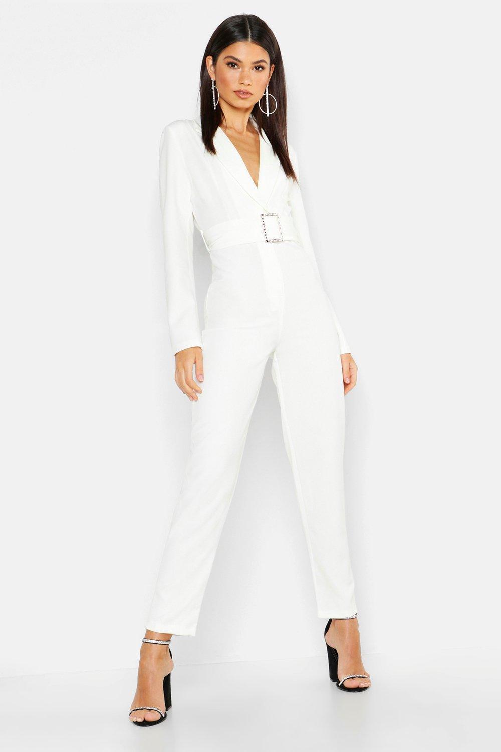 Boohoo Womens Woven Blazer Diamante Buckle Belted Jumpsuit - White - 10 See more Boohoo Full-length jumpsuits. Find on store We check over 450 stores daily and we last saw this product for A$30 at Boohoo. Go to Boohoo