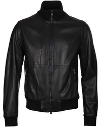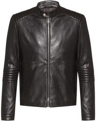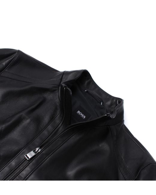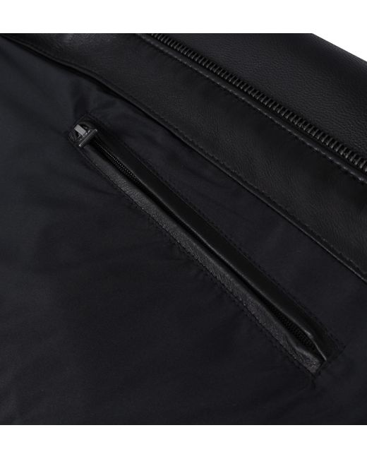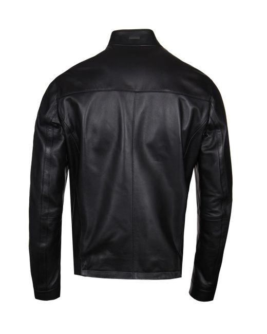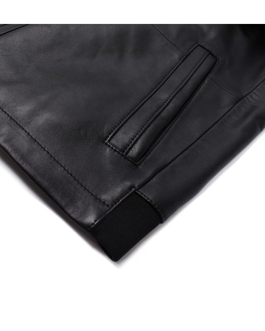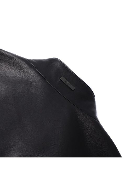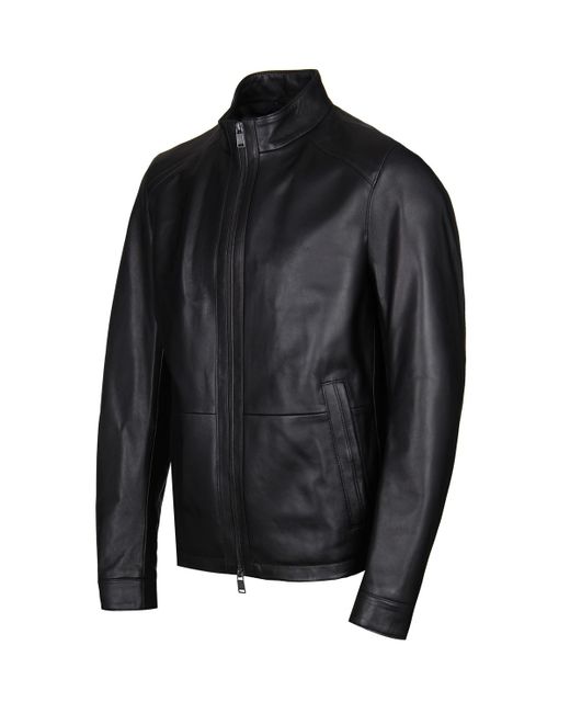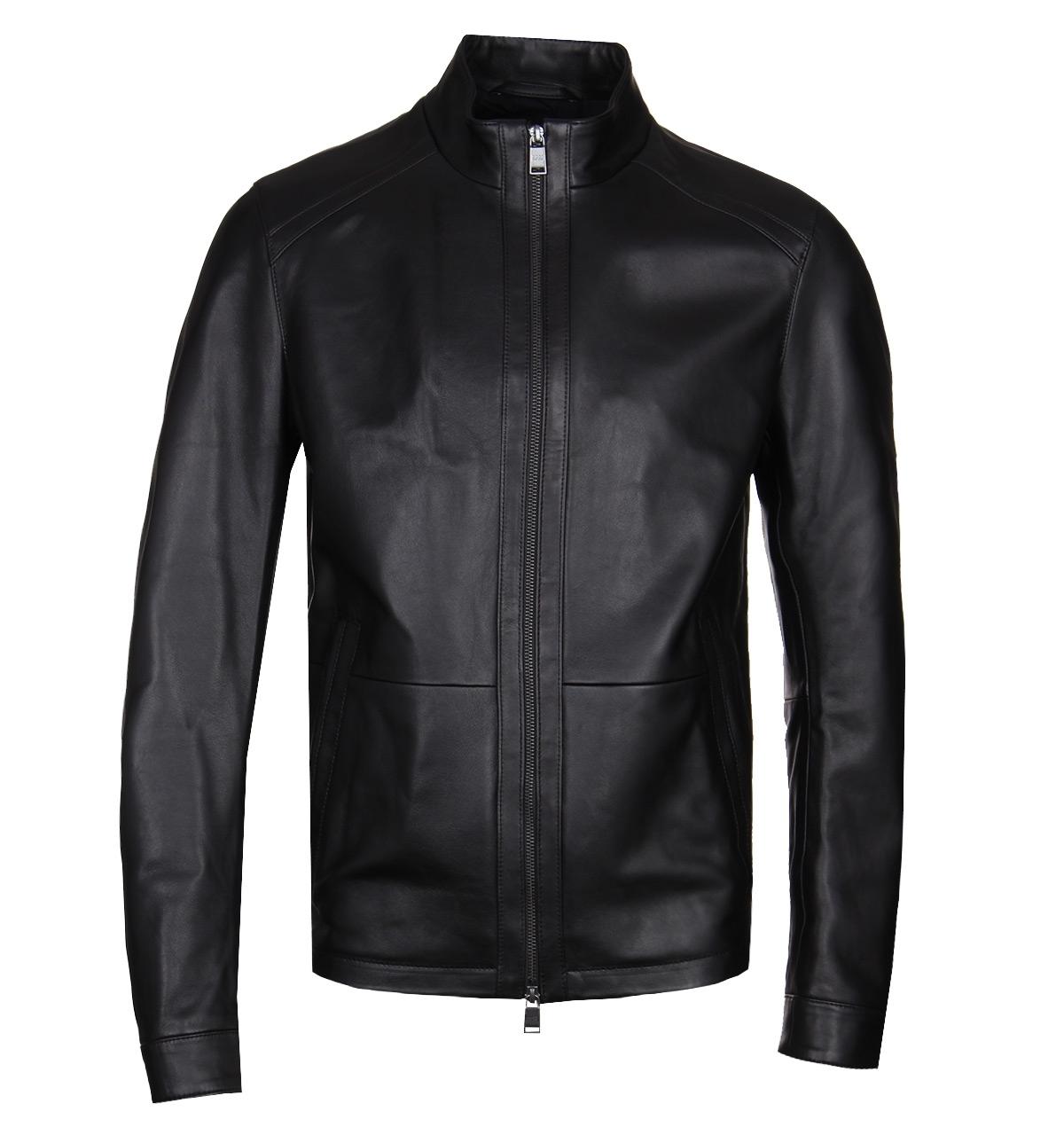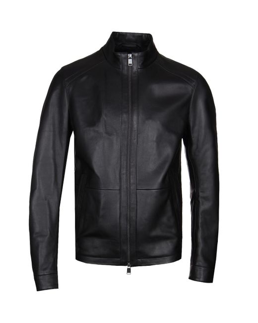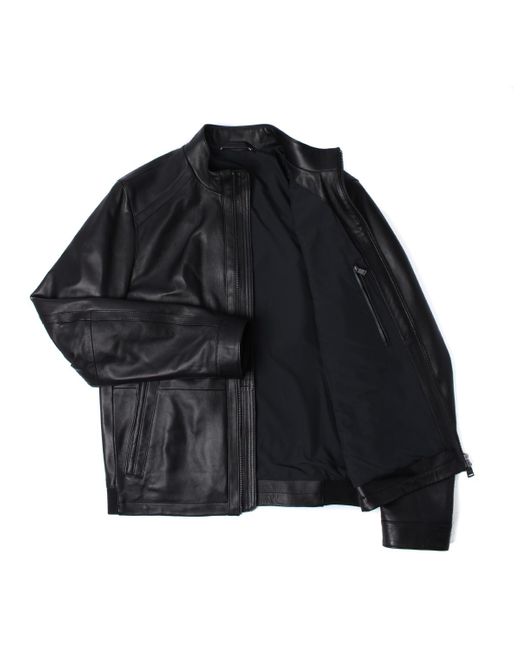 This leather blouson jacket is crafted from luxurious nappa lambskin which has a supple, smooth handle to it. This piece is cut to a straight fit in the slightly shorter blouson style and has a stand collar, zip placket, knit ribbing at the side seams and a metal branding detail at the rear collar. Regular fit. Nappa lambskin. Stand collar. Zip closure. Inside chest pocket. Zip side pockets. Style & Fit: Regular fit. Fits true to size. Fabric Composition & Care: 100% lambskin leather. Wipe clean. Colour: black