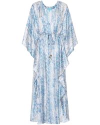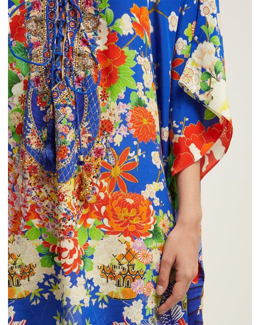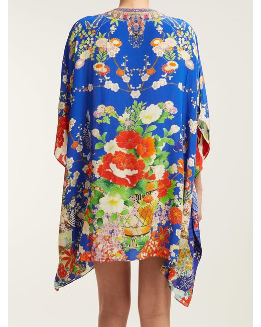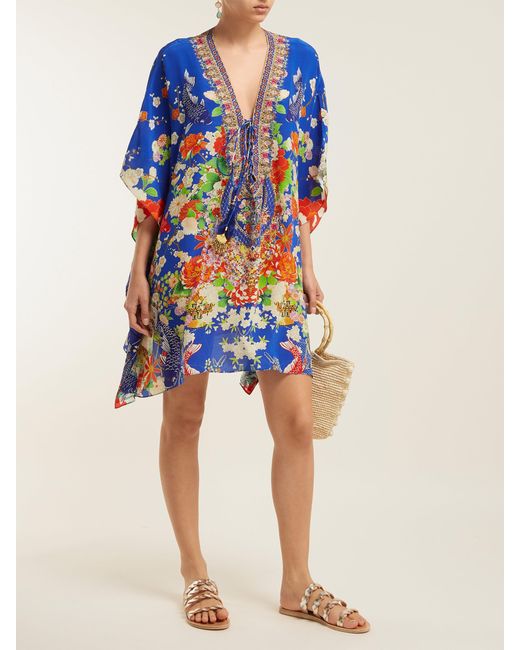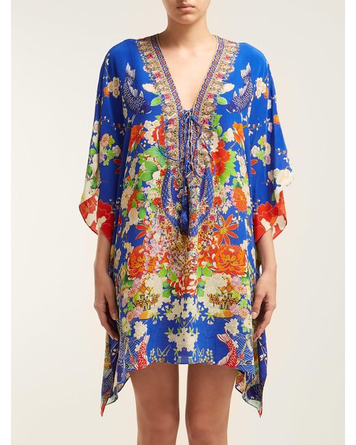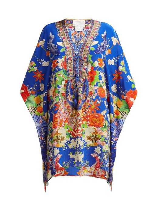 This vibrant blue kaftan showcases Camilla's Playing Koi print, which nods to traditional Japanese motifs. It's crafted from whisper-weight silk georgette to a loose silhouette that falls to a handkerchief hem and features tasselled ties at the V-neck, then is finished with subtle crystal accents. Slip it on with metallic sandals to complement the vivid hues when on vacation. 100% SILK. Colour: blue