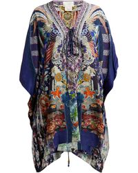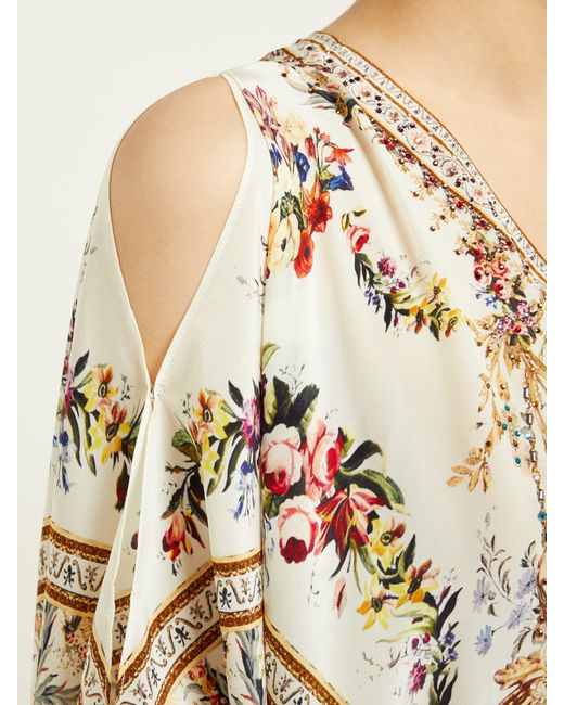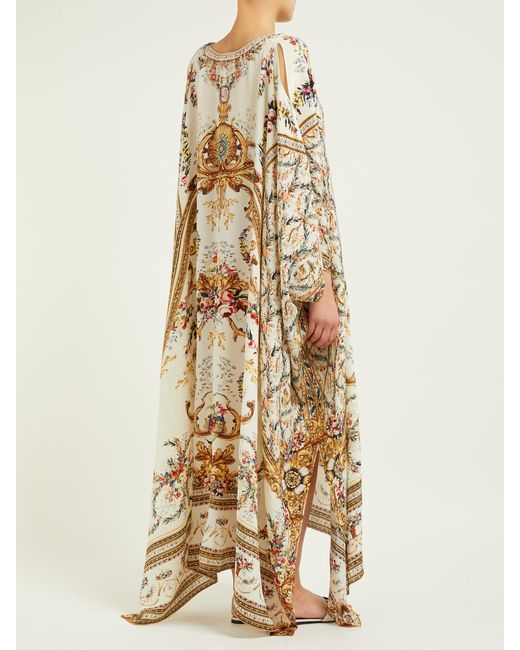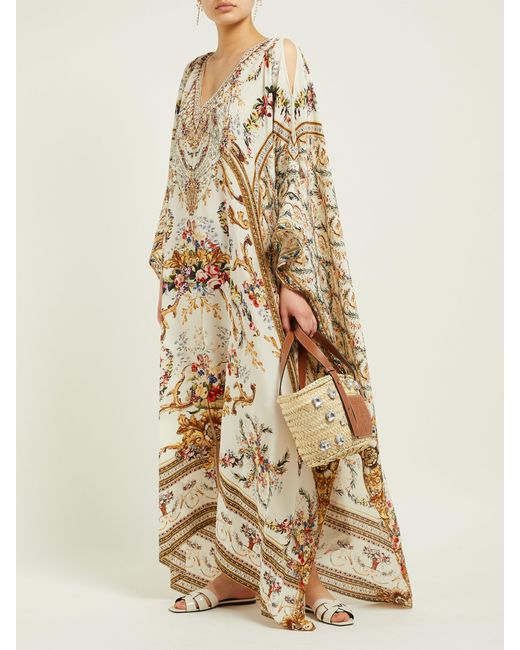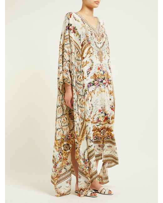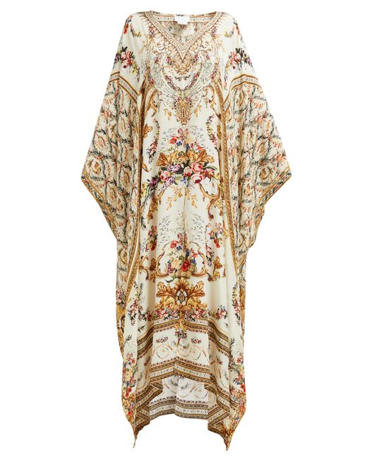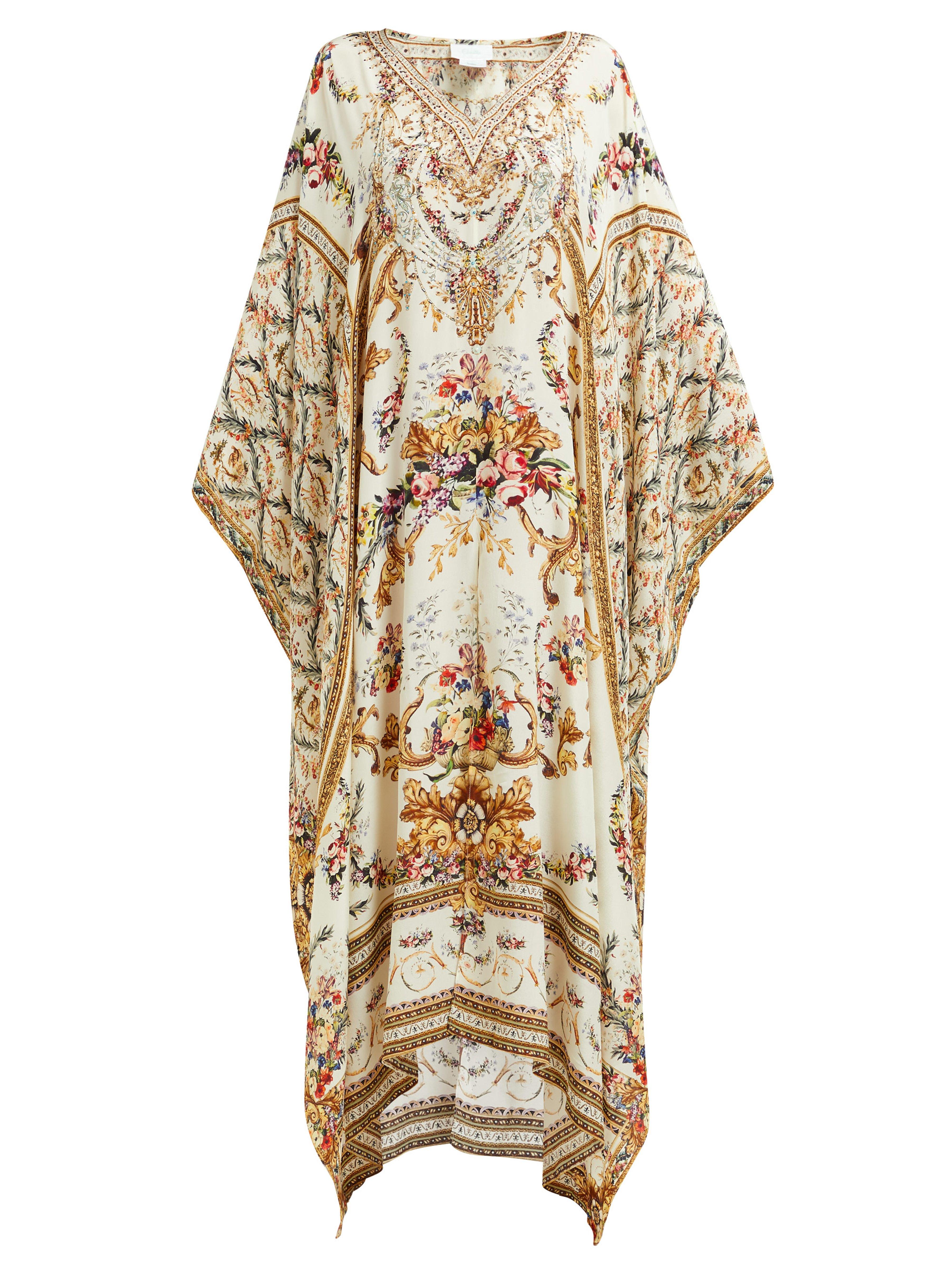 Camilla's more-is-more aesthetic is expressed by the hand-applied multicoloured crystals framing the V-neck of this ivory-white Olympe Ode-print silk kaftan. Illustrated by intricate flowers, it's cut to a loose silhouette with slender keyhole slits at the shoulders. Style it with a basket bag and leather sandals for a graceful impression. 100%SILK. Colour: multicolour