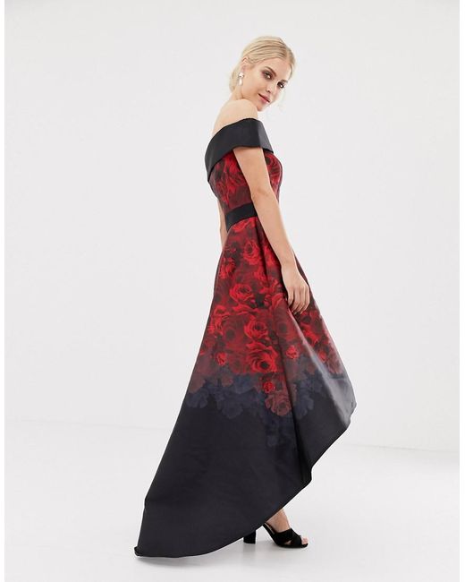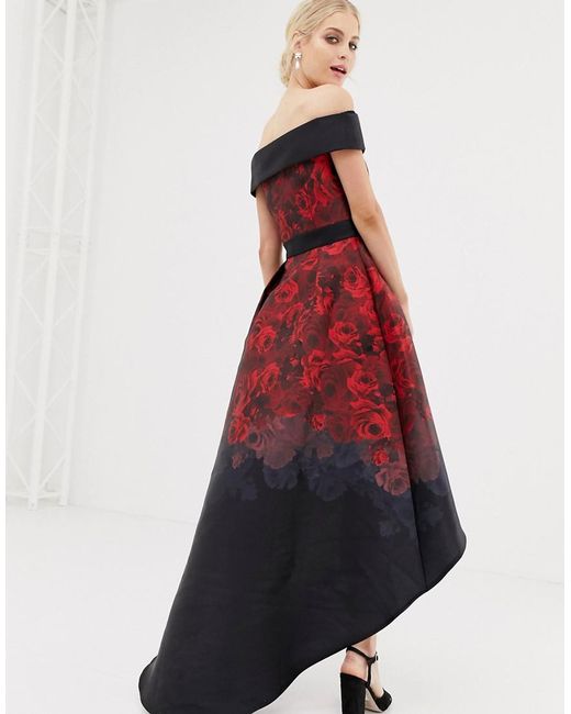 Dress by Chi Chi London, For that thing you RSVPd to, Off-shoulder design, Fitted waist, Floral print, High-low hem, Zip back, Regular fit, A standard cut for a classic shape. Big event on the agenda? We've got three words for you ' Chi Chi London. The ultimate dress destination, our edit of the brand's dresses, heels and clutch bags ticks all the boxes on your party checklist. Prom queens and bridesmaid squads, we've got you. Polyester/ print/ satin/ silk. Colour: red