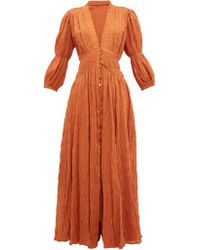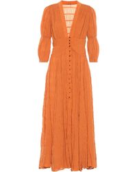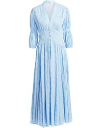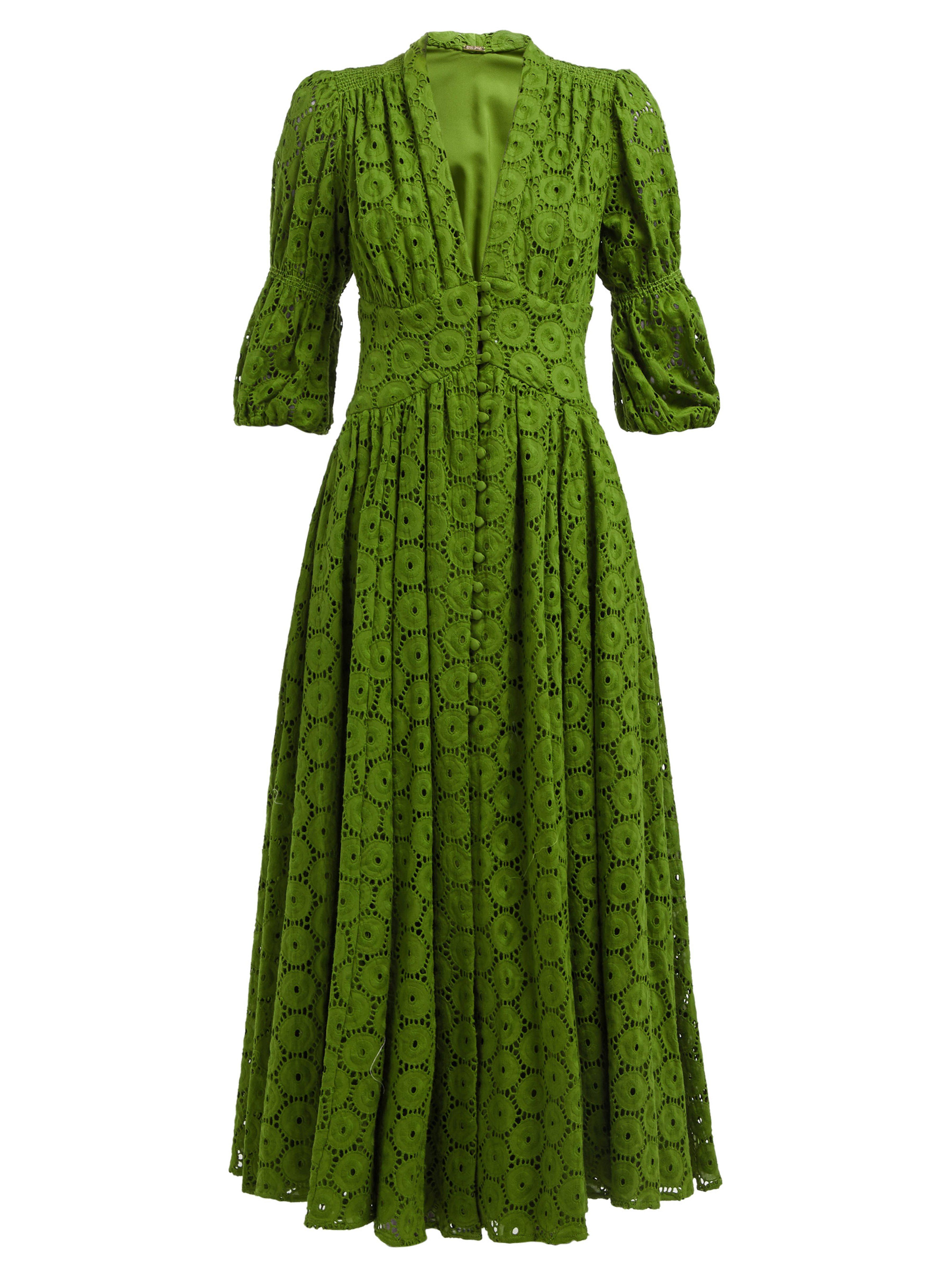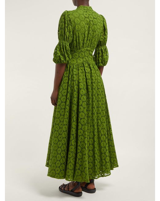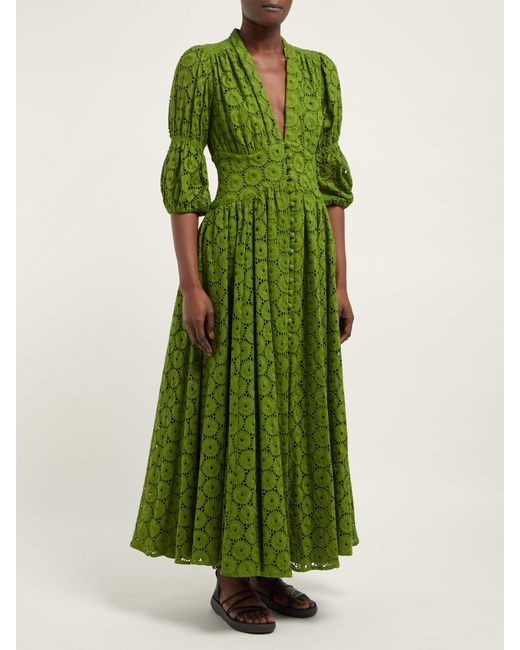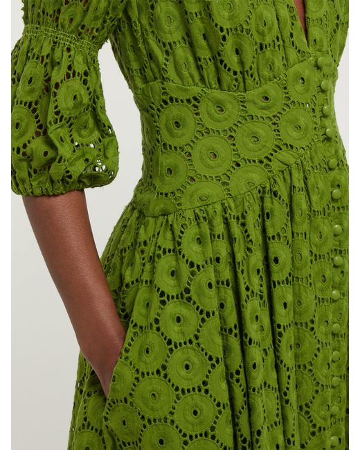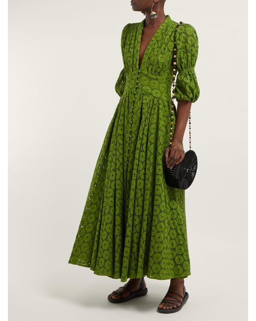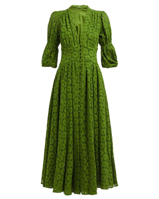 Cult gaia - designer jasmin larian focuses on feminine whimsy for cult gaia's resort 2019 collection, including this green cotton broderie anglaise willow midi dress. It's crafted in the usa with a flattering v-neckline leading towards a swinging full skirt that is shaped with dense gathers from the curved waistline panel. Style it with one of the label's cult-followed cross-body bags for an alfresco lunch date. 100% cotton, 100% polyester. Colour: green