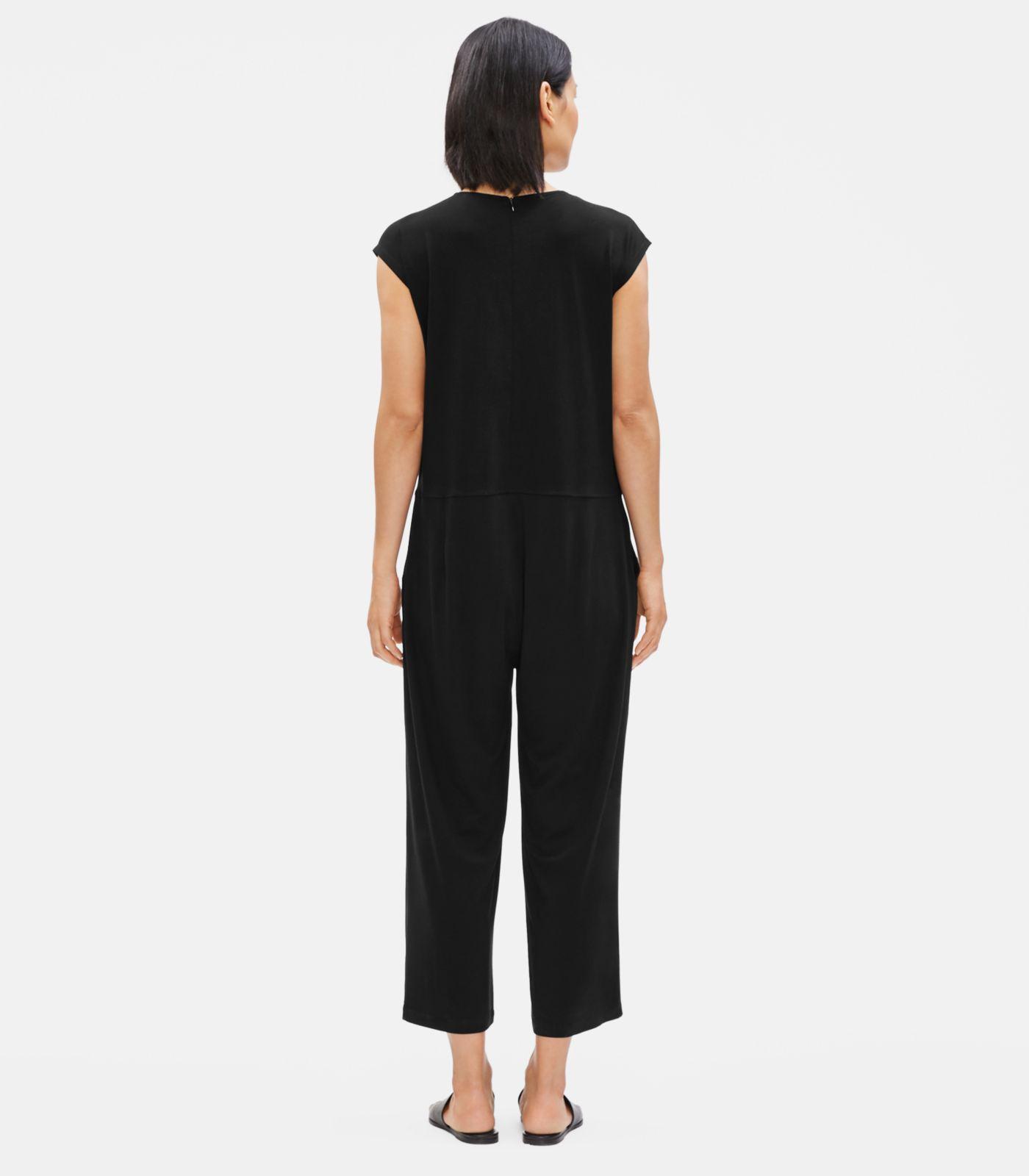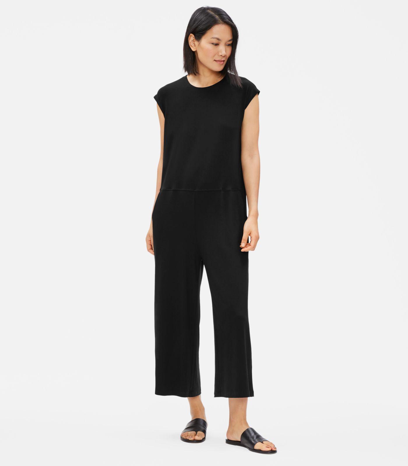 Go to Eileen FisherEasy and fluid, a wide-leg jumpsuit with a round neck and cap sleeves. An everyday shape you can dress up or down. In our polished and sustainable TM jersey. Designed with a fit that's slimmer through the hips, wider through the leg. Round neck, cap sleeves, waist seam, front pockets. Centre back seam with concealed zipper. Ankle length with 22-inch inseam. Material: a fluid, body-skimming knit with polish that's right for any occasion. TM fibre is made from responsibly harvested trees. Knit and dyed in montreal. Cut and sewn in the us. This garment is responsible by design. That means it meets our highest standard for environmental or social impact. It reflects our efforts to take responsibility for what we make, always looking for more sustainable materials and methods. Model is 5'10" and wearing a size small, which measures 54 inches on the body. We recommend machine wash cold. May be dry cleaned. 93% /7% spandex. Usa: our factories. Today 97% of garments sold in the us are knit or sewn elsewhere; we produce 25% of ours in new york and california. Responsible fiber: ®. Starts with responsibly harvested trees. The fibre is produced with near zero waste--99.5% of all water and solvents are recycled. Safer for workers, better for the environment. Colour: black