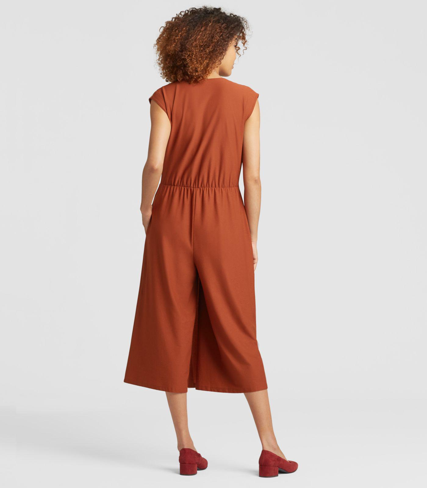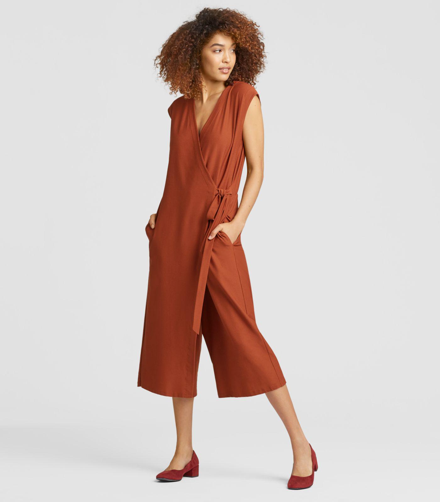 Go to Eileen FisherA jumpsuit with the look of a dress. Adjust the ties, enjoy the wide-legged ease. In our signature washable stretch crepe. Designed with a relaxed fit. Wrap front, v-neck, cropped wide leg, onseam pockets. 21-inch inseam (size small). Wrap front secured with interior and exterior ties. Back is shaped with elastic at the waist. Material: our signature lightweight washable stretch crepe: a textural knit with a unique combination of sophistication and stretch. Packs beautifully, goes everywhere. Knit and dyed in france, cut and sewn in nyc. 5'10" model is wearing a size small, which measures 35 inches on the body. We recommend machine wash cold. 66% viscose/27% nylon/7% spandex. Usa: our factories. Today 97% of garments sold in the us are knit or sewn elsewhere; we produce 25% of ours in new york and california.