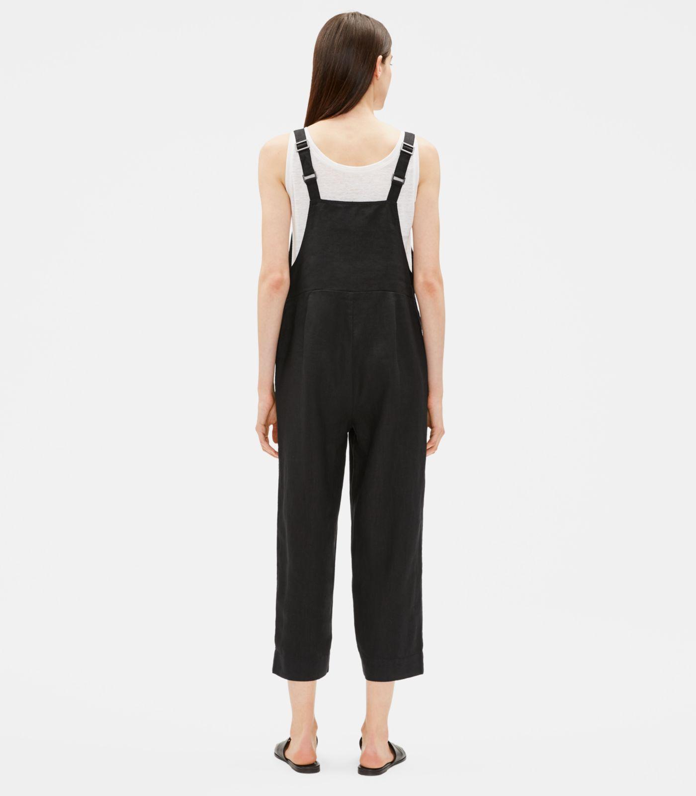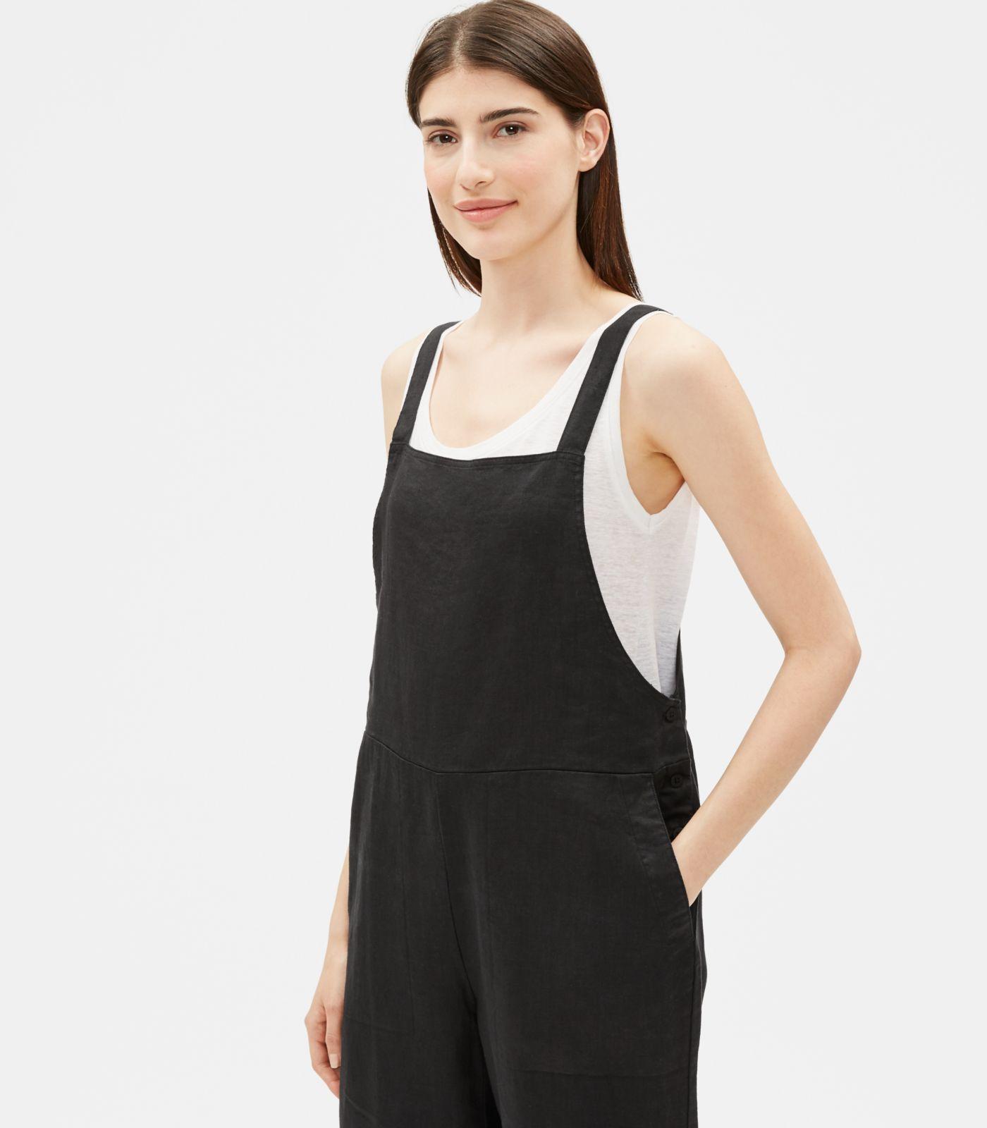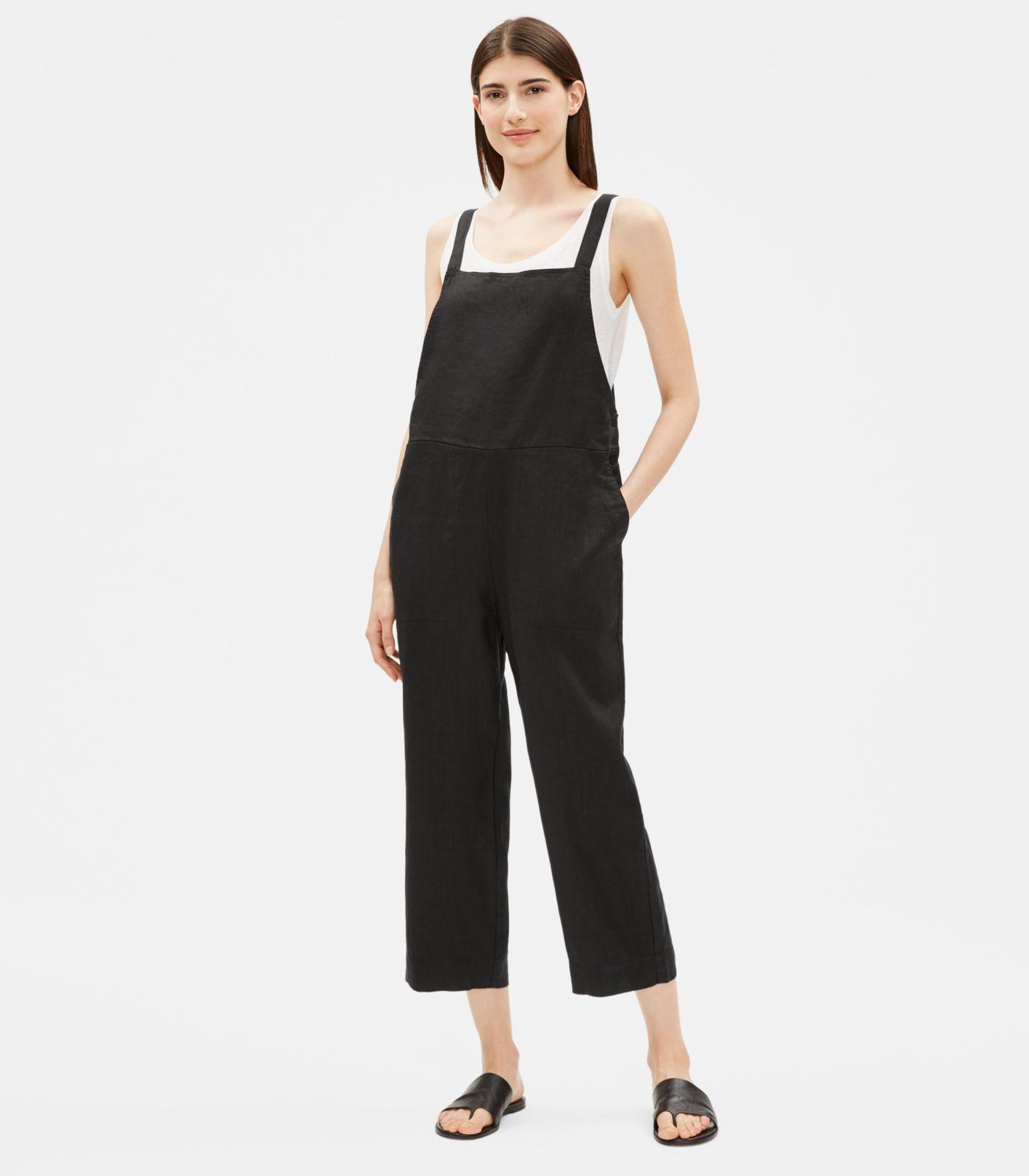 Go to Eileen FisherA jumpsuit with the soul of an overall. In a naturally textured organic linen. Washed for a relaxed feel. Designed with an easy, straight fit. 14 3/4-inch adjustable straps, 9-inch front bib, 6 1/4-inch back bib, front angled pockets. 3-button side closure with corozo shell buttons, antiqued silver hardware. 10 3/4-inch rise; 25-inch inseam (size small). Material: the natural texture of linen in a medium-weight weave--not too heavy, not too light. Washed for a relaxed feel. Organic farming supports clean water and healthy soil. This garment is responsible by design. That means it meets our highest standard for environmental or social impact. It reflects our efforts to take responsibility for what we make, always looking for more sustainable materials and methods. Model featured is 5'10". We recommend hand wash cold. May be dry cleaned. Colour transfer may occur with washing and wearing on dark colours. Made in indonesia. 100% organic linen. Organic linen. Linen is commonly grown in rotation with food crops. By choosing organic linen, you're supporting healthy clothes--and a healthy food supply. Colour: black