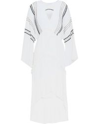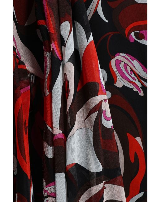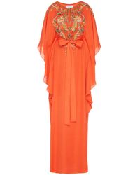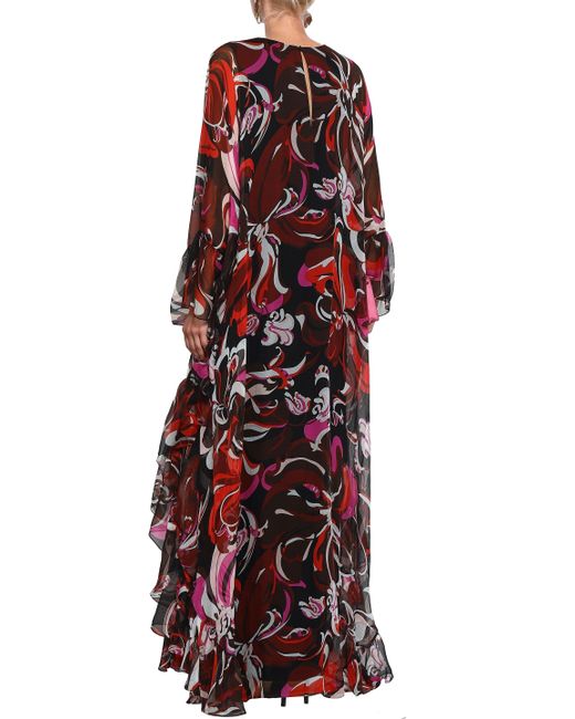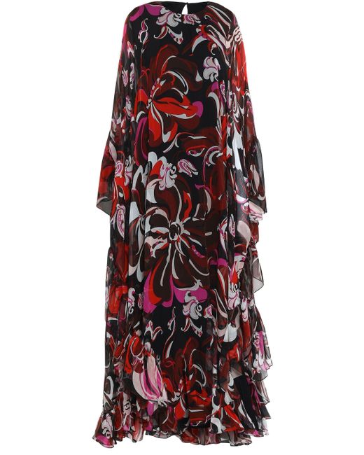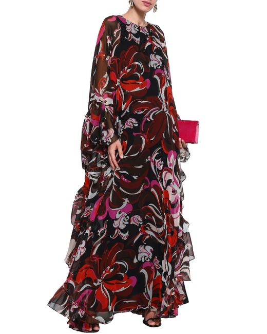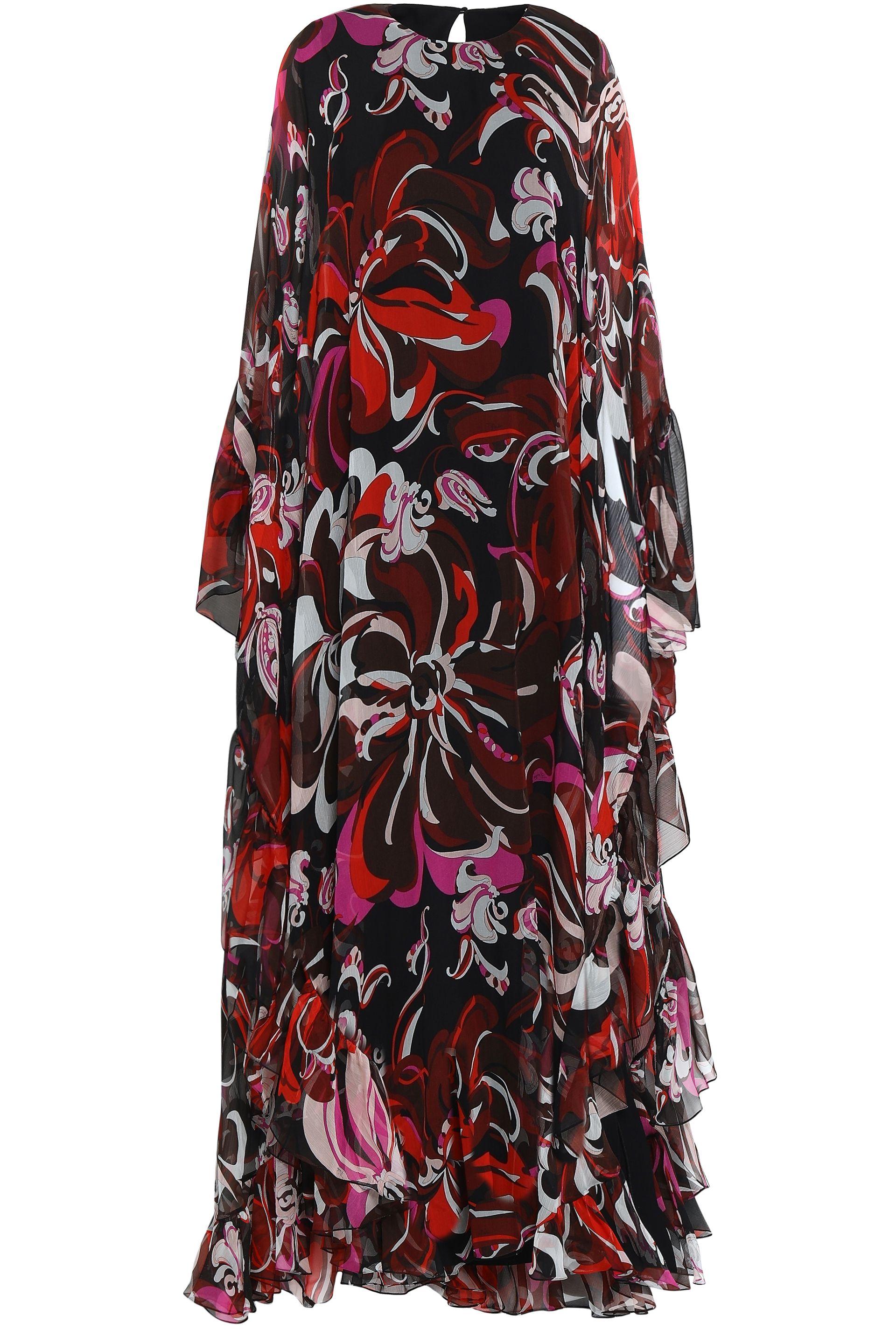 Kaftan Maxi length Printed Georgette Ruffled Zip fastening through back Button-fastening keyhole at back Non stretchy fabric with stretchy lining Dry clean. Made in Italy. 82% Silk, 17% Viscose, 1% Elastane. Colour: black
