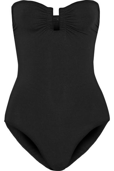 A timeless summer staple, Eres' sleek bandeau swimsuit is cut from the brand's signature peau douce fabric for an ultra smooth silhouette. It's designed with a concealed U-ring for structure and gummed internal band that keeps it securely in place. Wear it with: Fendi Sunglasses. Black stretch-polyamide. Pulls on. 77% polyamide, 23% elastane. Machine wash or dry clean. Made in France Small to size. Colour: black