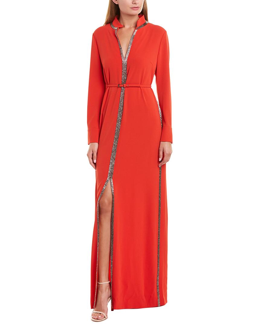 This item tends to run large (based on Member feedback). We recommend sizing down for your best fit. Color/pattern: melon. Approximately 62in from shoulder to hem. Measurement was taken from a size 38 and may vary slightly by size. Model is 5ft 10in. Design details: mock collar, split neck, beaded trim, button cuffs, vented front hem, removable belt at waist. Centre back zipper. Shell: 83% triacetate, 17% polyester. Trim: 100% silk. Dry clean only. Colour: orange