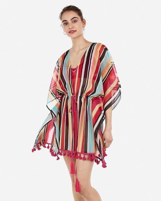With a flattering self-tie cinched waist, vibrant stripes and pom accents, we think this fun and flirty swim cover-up might be your new favorite. Throw this on over any suit for a fabulous sunny day look. Straight hem with pom accents, Machine wash. Colour: red