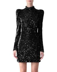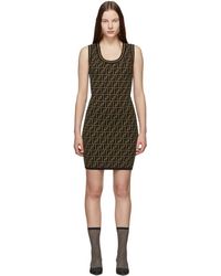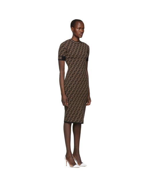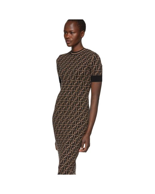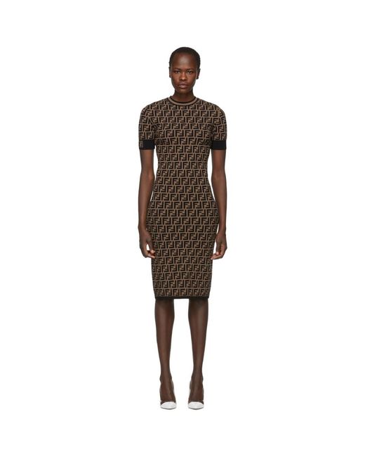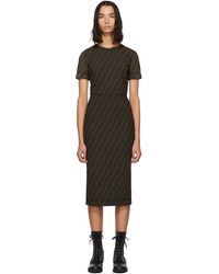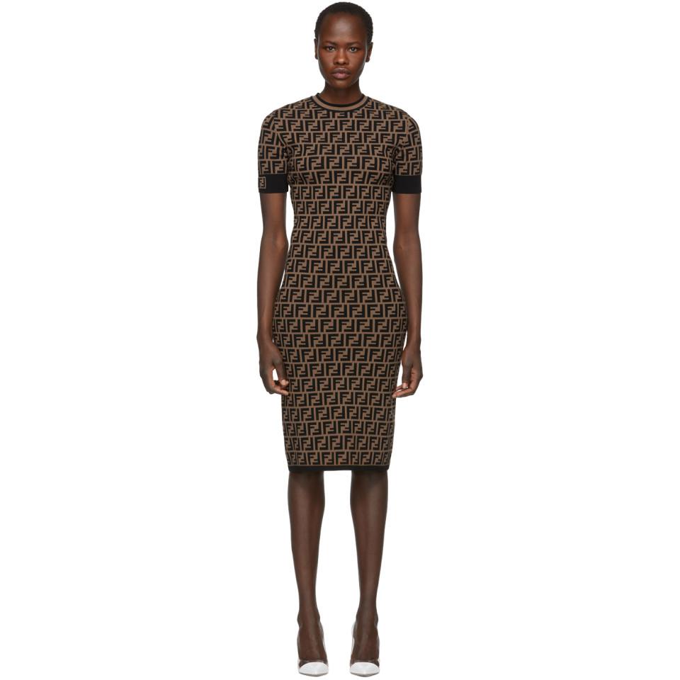Short sleeve knit viscose-blend short dress in brown featuring logo pattern knit in black throughout. Rib kit crewneck collar, cuffs, and hem. Knit logo patch at sleeve. Tonal stitching. Colour: black