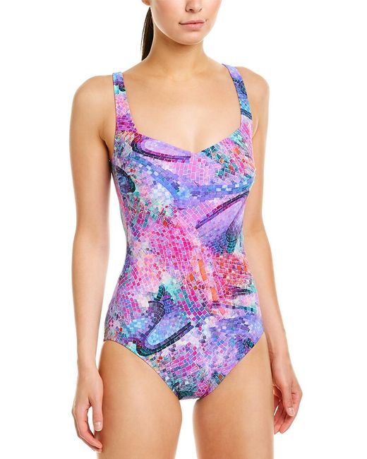 Color/pattern: multicolor purple. Design details: adjustable stretch shoulder straps, mosaic print, moderate seat coverage. 72% polyamide, 28% elastane. Hand wash.