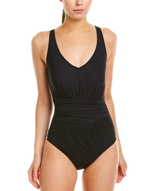 Color/pattern: black. Design details: ruched and shirred front, built-in bra with molded cups, adjustable shoulder straps. Moderate coverage. Self: 59% polyamide, 41% elastane. Combo: 72.5% polyamide, 27.5% elastane. Hand wash.