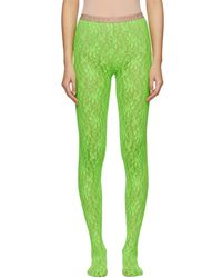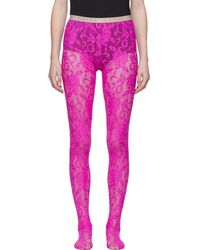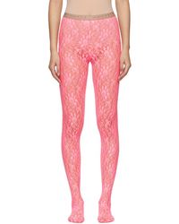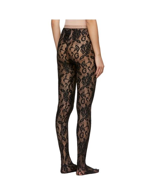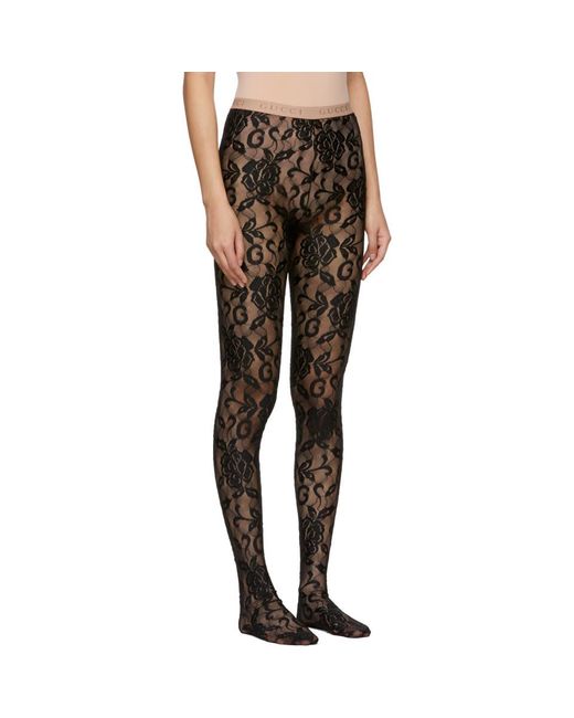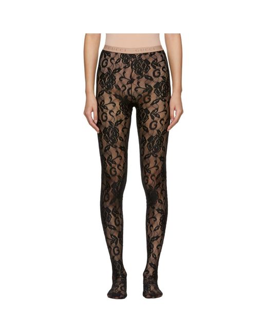 Stretch floral lace tights in black. Elasticized waistband featuring logo knit in beige. Tonal stitching. Colour: black