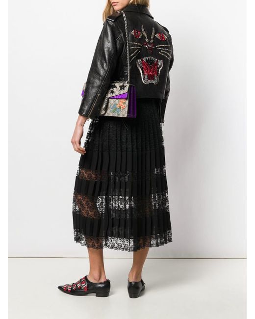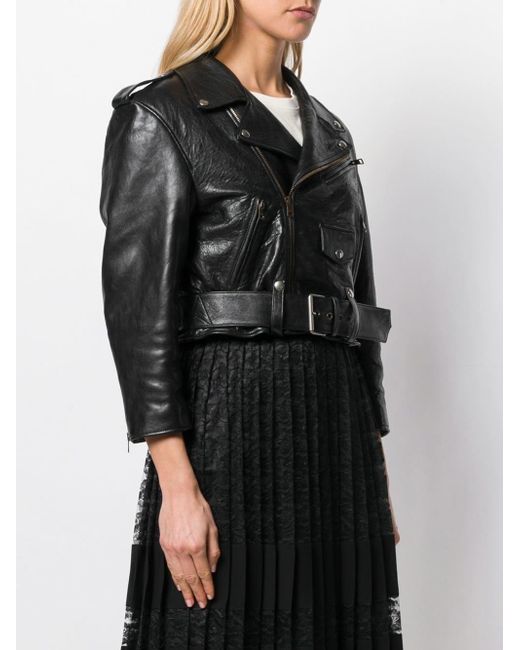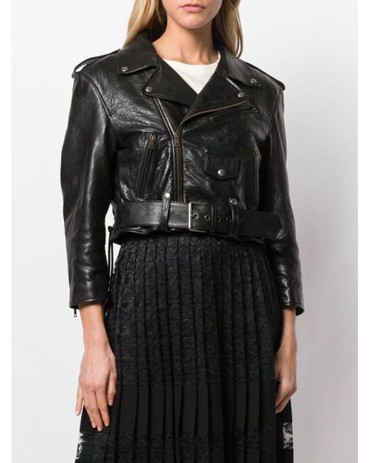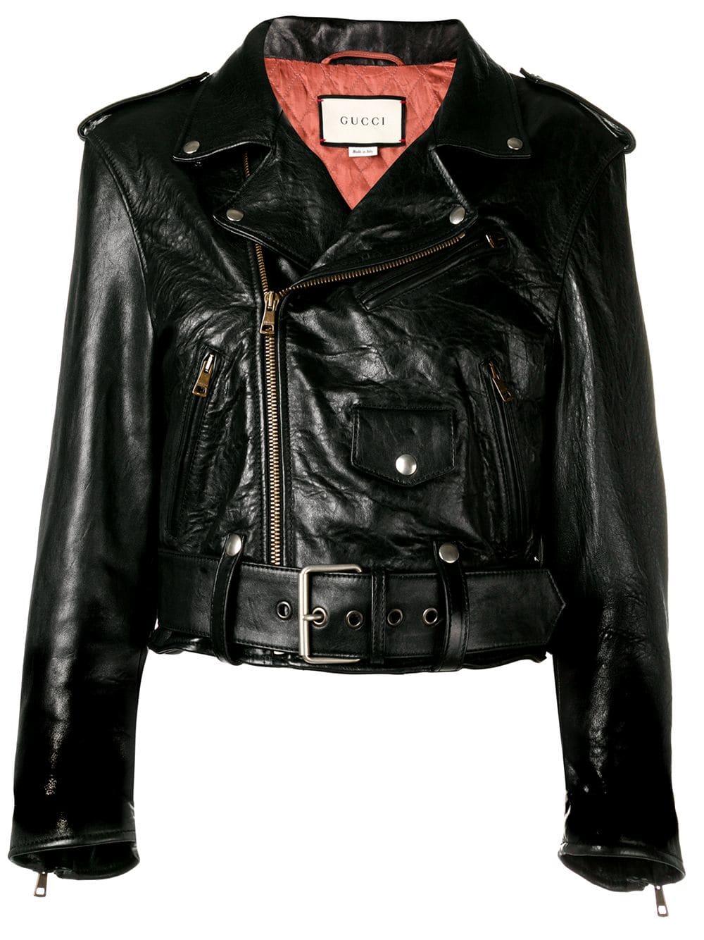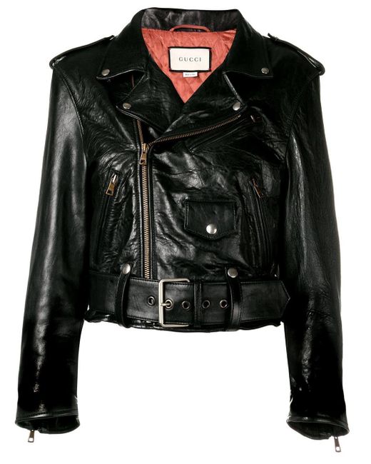 Luxury means you show the way you dress with eccentricity. It's almost like a new kind of jet set - instead of roaming around the world, you're roaming with your clothes' said Gucci's creative director. Made from lamb skin leather, this black biker jacket has long sleeves, wide lapels, a cropped length, a buckle belted waist and a crystal embellished design. Material:Cupro/Lamb Skin/Polyester. Colour: black