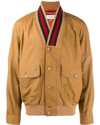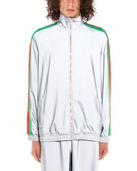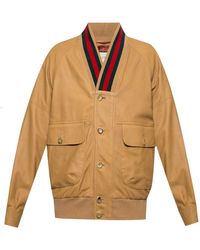 Originally inspired by the equestrian world, the Web takes on new forms this season. Here the stripe motif adds contrast to a leather jacket. Black leather. Green/red knit Web trim. Front zipper pockets. Zipper closure. 24.4" length. Silk lining. Made in Italy. Material:Silk/Leather.