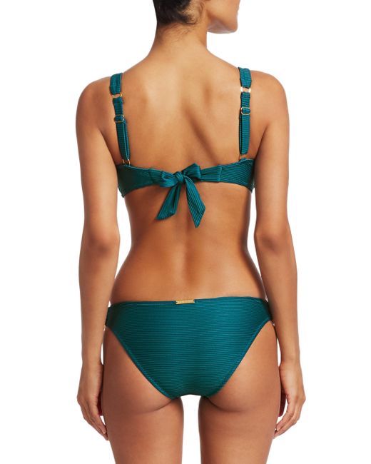 Textured knit swim top with goldtone buckle detail mid-bust. V-neck; Adjustable straps; Back tie; Underwire bra with soft boning; Lined; Nylon/spandex; Hand wash; Please note: Bikini bottom sold separately.