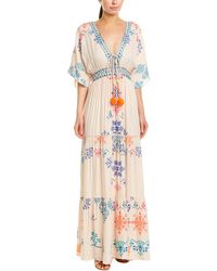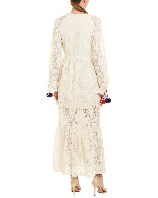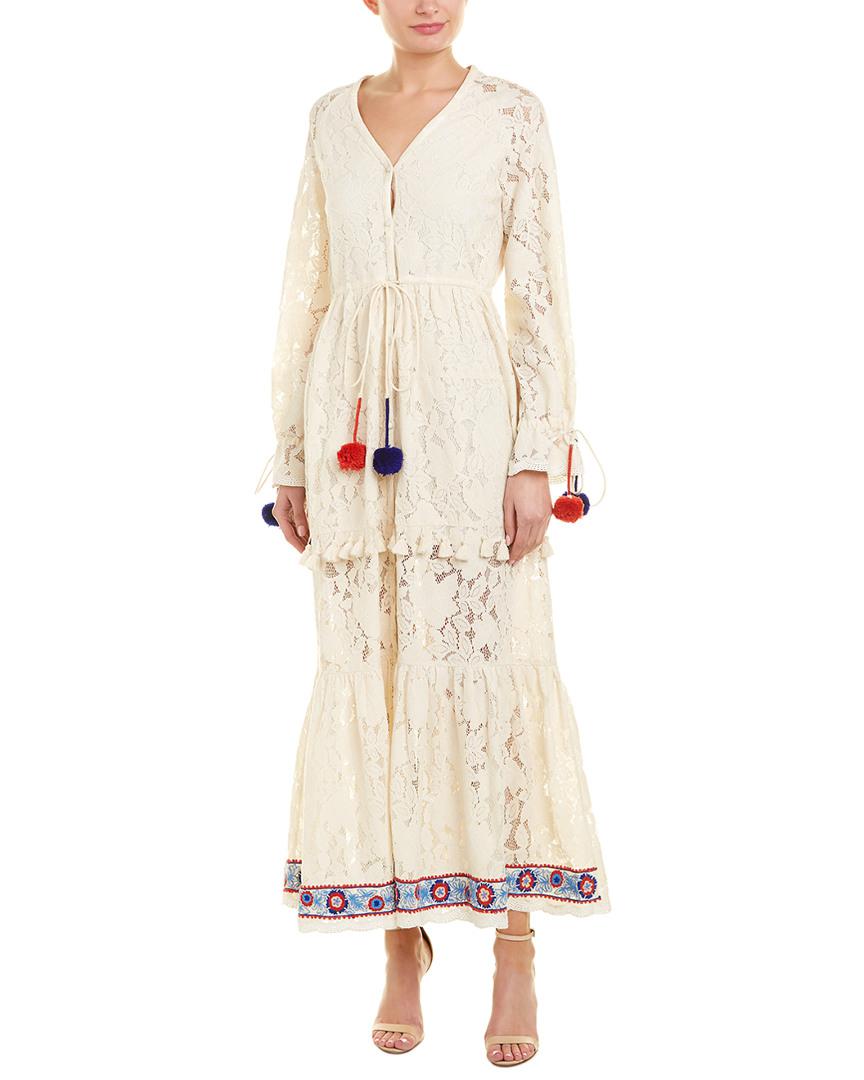 Color/pattern: white Approximately 56in from shoulder to hem Measurement was taken from a size small and may vary slightly by size Model is 5ft 10in Design details: lace design, sheer sleeves, drawstring waist and cuffs, tassel fringe trim, tiered skirt with embroidered hem Button front Shell: 100% cotton Lining: 100% rayon Dry clean only Imported. Colour: white