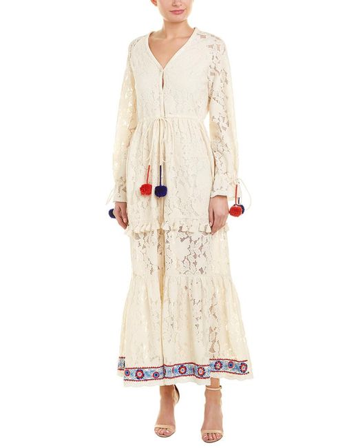 Color/pattern: white. Approximately 56in from shoulder to hem. Measurement was taken from a size small and may vary slightly by size. Model is 5ft 10in. Design details: lace design, sheer sleeves, drawstring waist and cuffs, tassel fringe trim, tiered skirt with embroidered hem. Button front. Shell: 100% cotton. Lining: 100% rayon. Dry clean only.