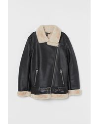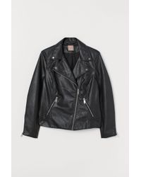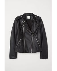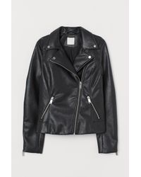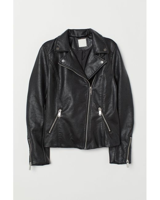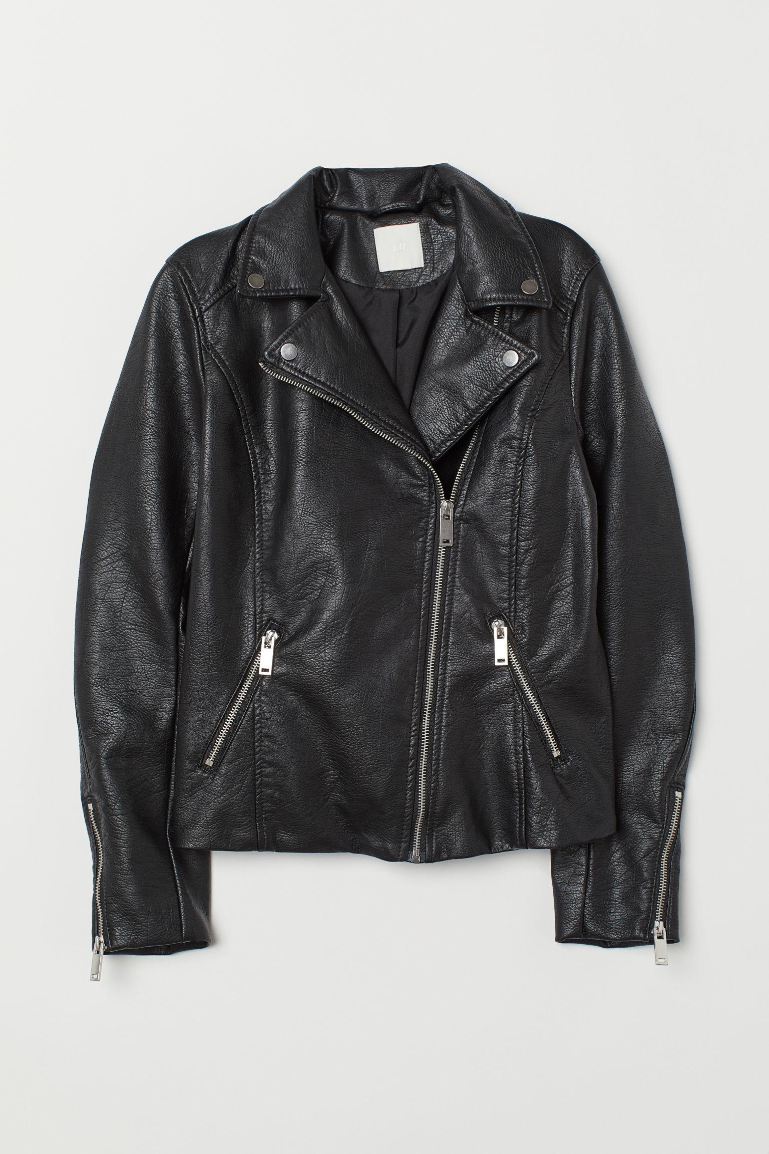 Biker jacket in grained faux leather with notched lapels with decorative snap fasteners. Zip at front, pockets with zip, and zip at cuffs. Lined. Lining: Polyester 100%. Coating: Polyurethane 100%. Viscose 86%, Polyester 14%. Machine wash cold. Colour: black