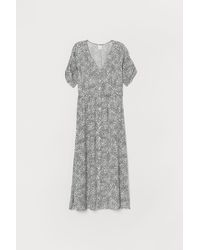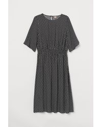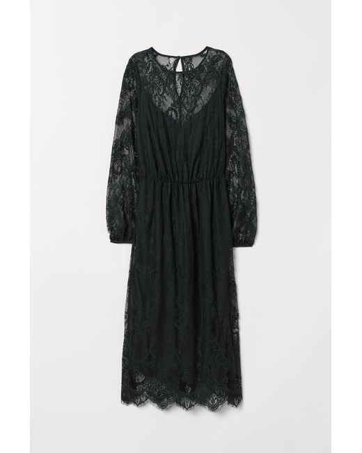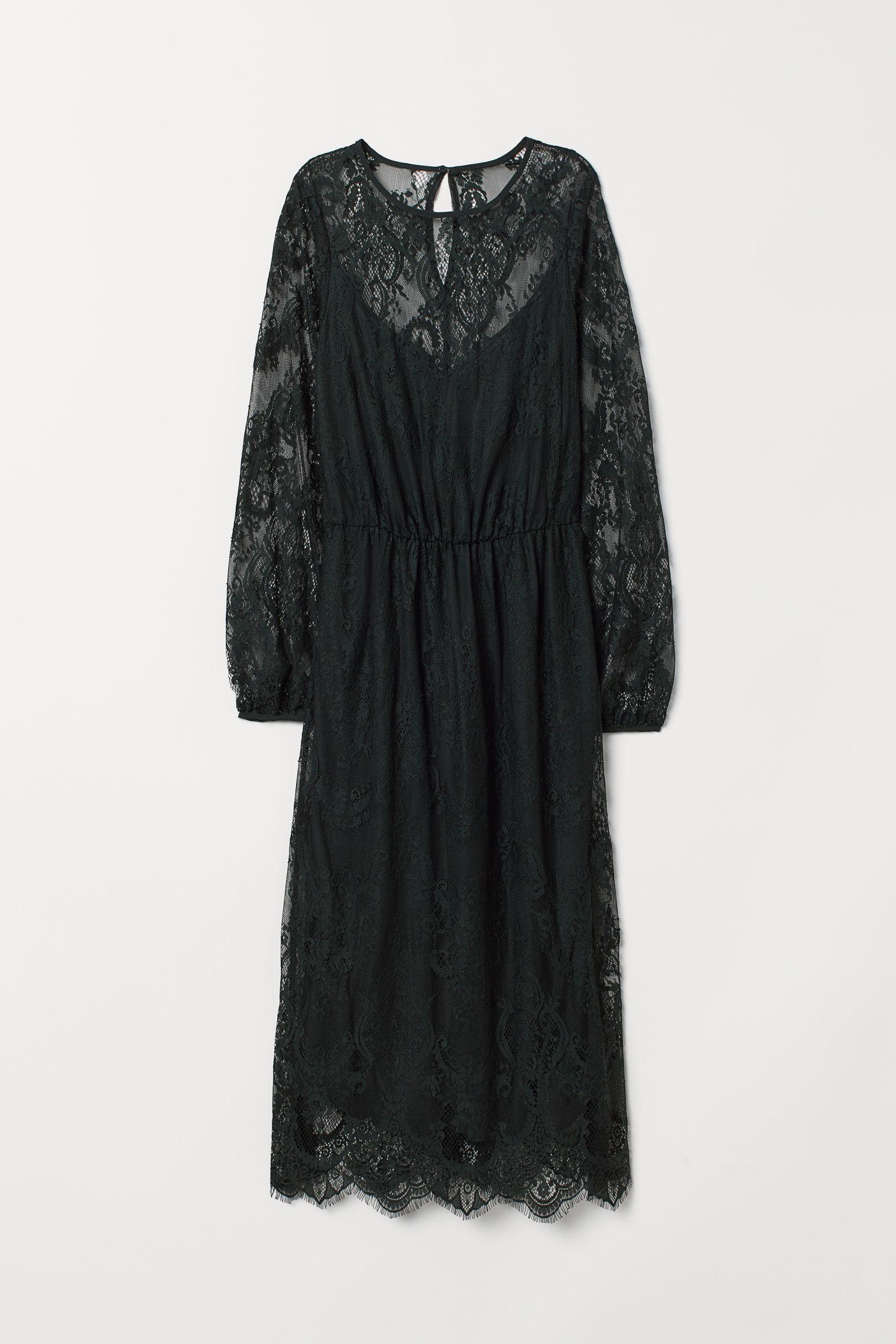 Calf-length dress in lace with a round neckline and an opening with a concealed button at the back of the neck. Elasticated seam at the waist and long sleeves with gathered cuffs. Jersey lining. Colour: green