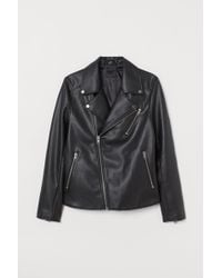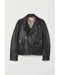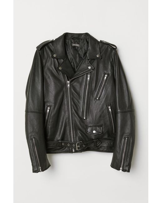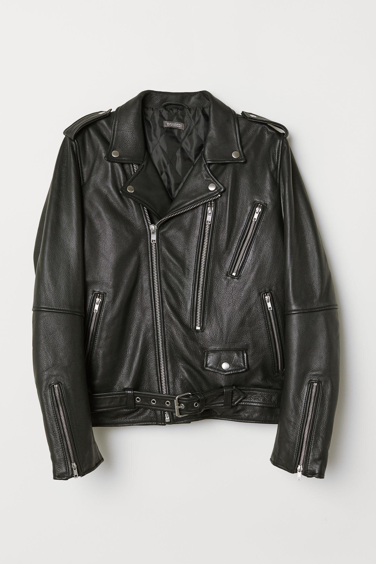 PREMIUM QUALITY. Padded leather biker jacket with a diagonal zip down the front, lapels with press-studs and shoulder tabs. Zipped side and chest pockets, a small flap pocket with a press-stud and one inner pocket. Long sleeves with a zip at the cuffs and a sewn-in adjustable belt at the hem. Polyester filling. Lined. Colour: black