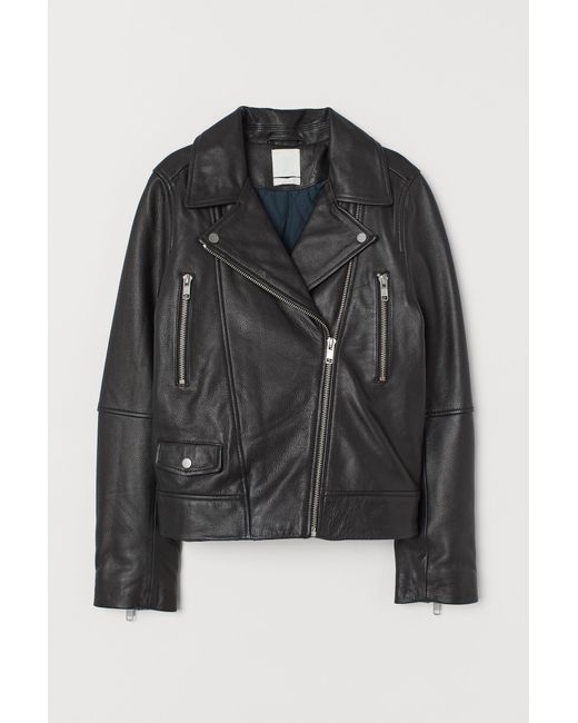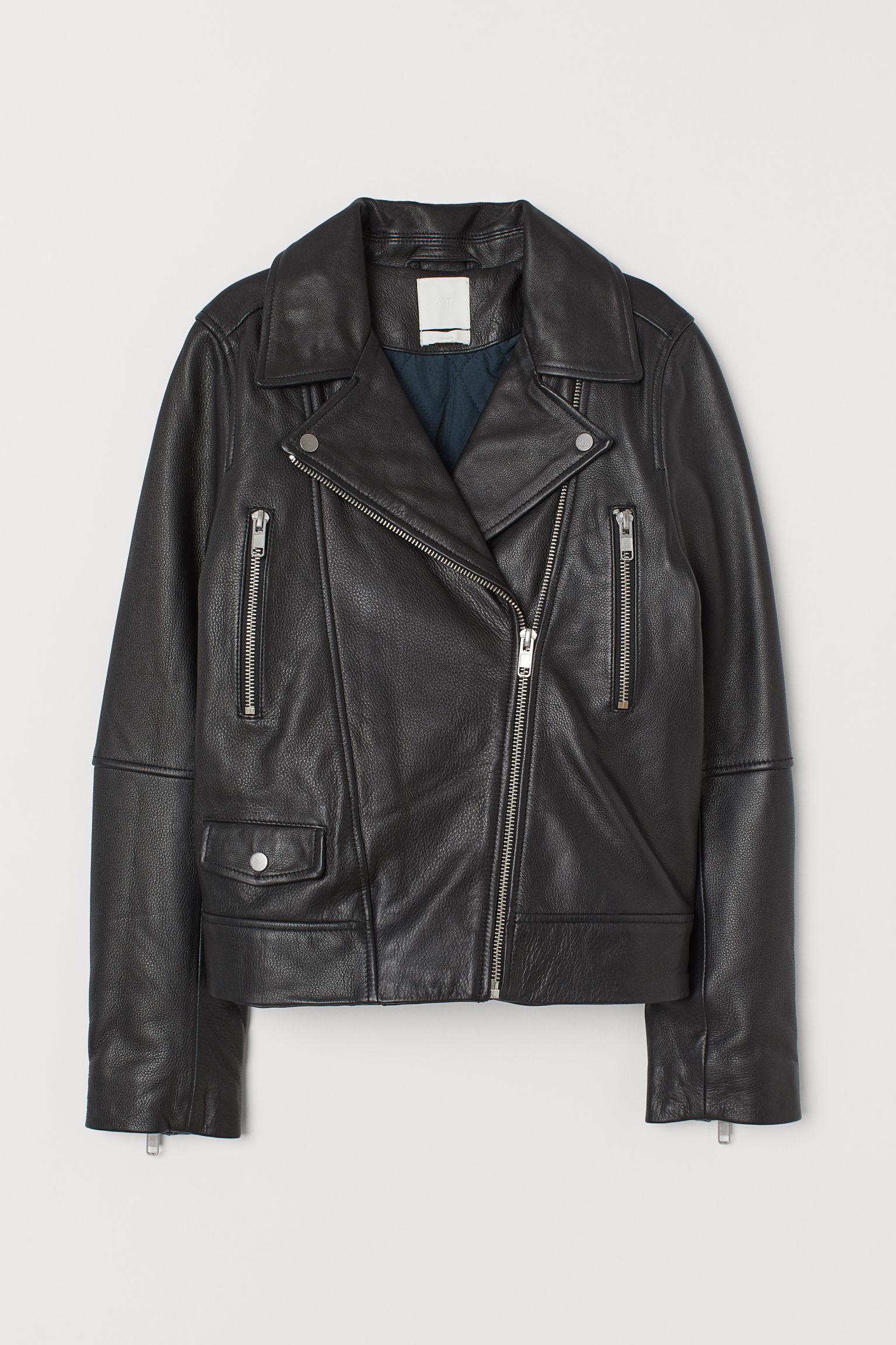 PREMIUM QUALITY. Biker jacket in soft, supple leather. Diagonal zip at front, notched lapels with snap fasteners, and cuffs with zip. Chest pockets with zip and a small front pocket with flap and snap fastener. Lined. Leather 100%. Lining: Polyester 100%. Machine wash cold. Colour: black